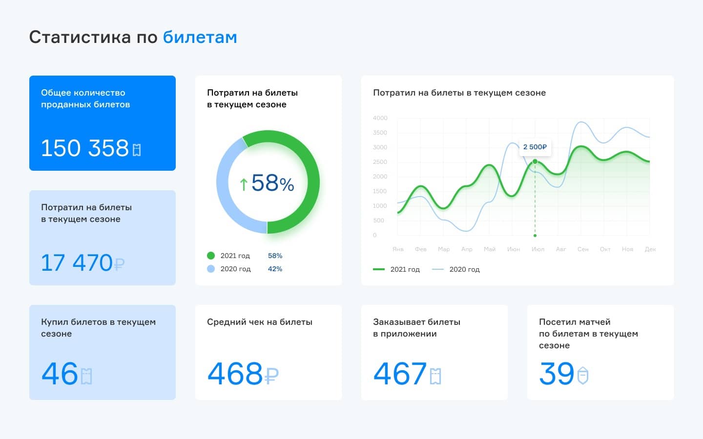 - Статистика по билетам. По растущему или падающему графику сразу видно, насколько популярны матчи в сезоне, как эффективно работают менеджеры. Отдельными карточками выделены основные показатели: количество проданных билетов в сезоне и всего, средний чек, сколько людей пришло на матчи.