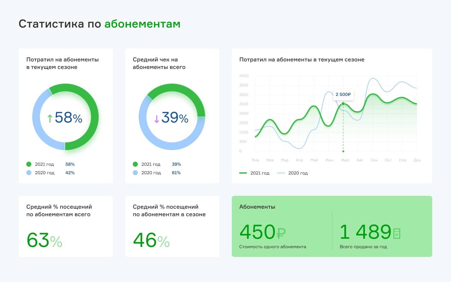 - Статистика по абонементам. На графиках и диаграммах видна динамика покупок абонементов, сколько абонементов купили и какой процент посещений матчей по ним.