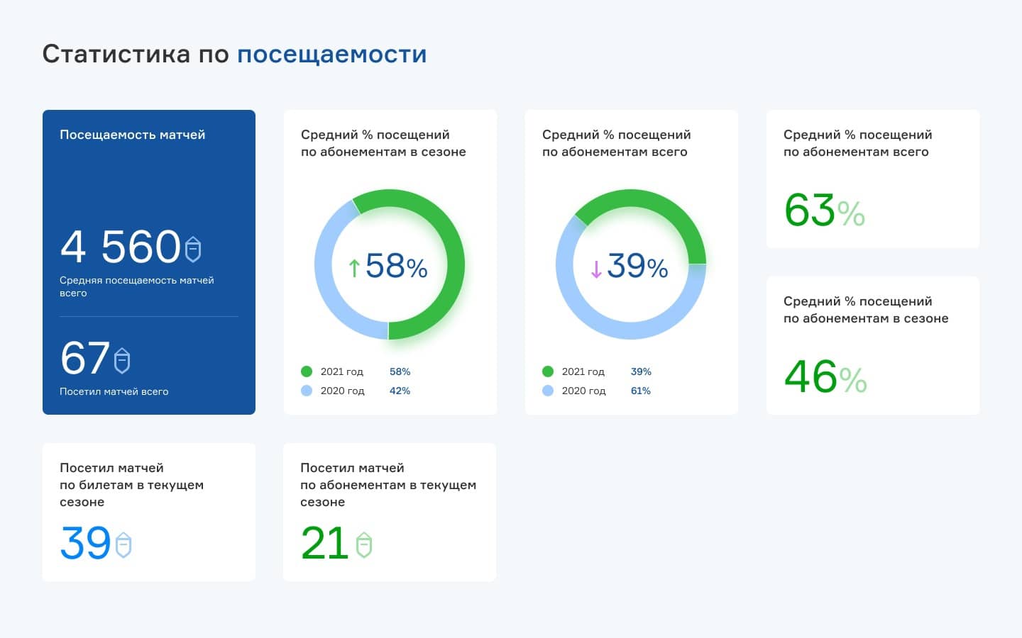 - Статистика посещаемости. На графике и в цифрах видно, насколько матчи в этом сезоне популярнее, сколько людей пришло по абонементам и билетам.