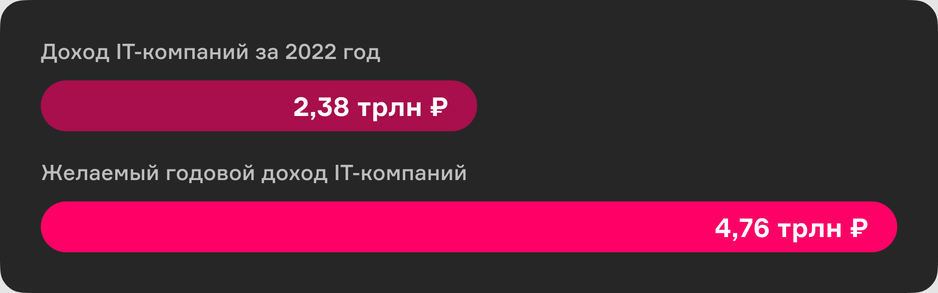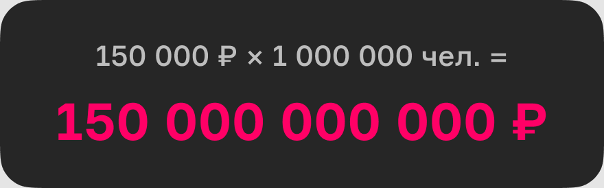 В 2022 году IT-компании в России заработали 2,38 трлн ₽, то есть по ≈ 200 000 000 000 ₽ в месяц. Значит, чтобы обеспечить работой ещё один миллион разработчиков, нужно зарабатывать минимум в два раза больше.