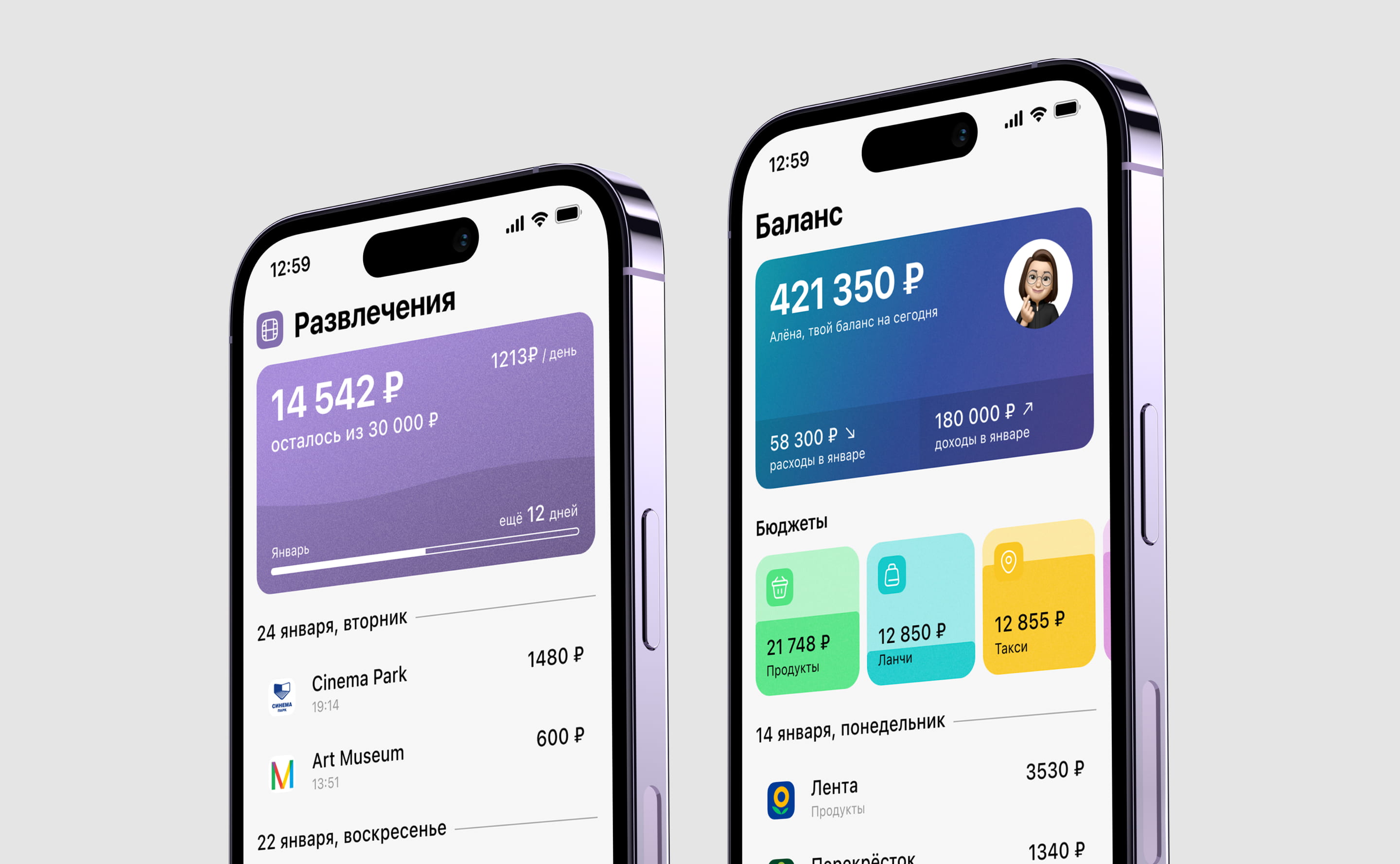 «Баланс» — здесь всё, что нужно пользователю прямо сейчас. Сложные данные мы визуализировали с помощью иконок и цветов: например, динамику расходов и остаток бюджетов.