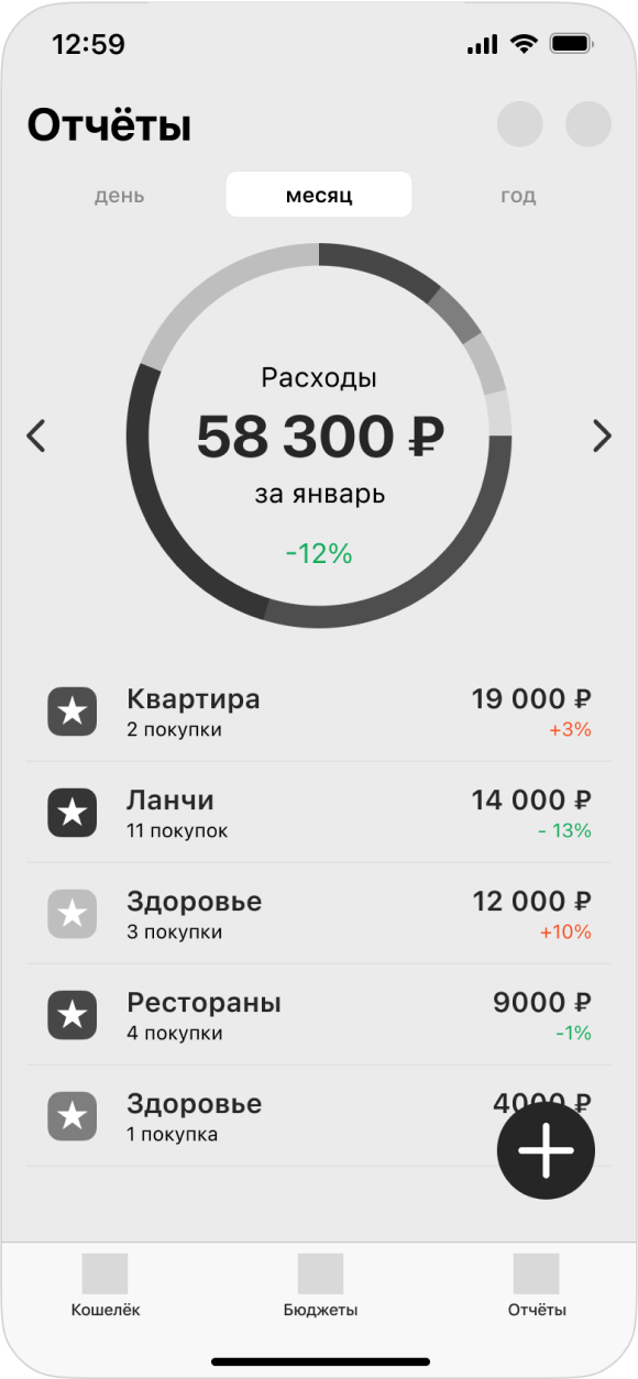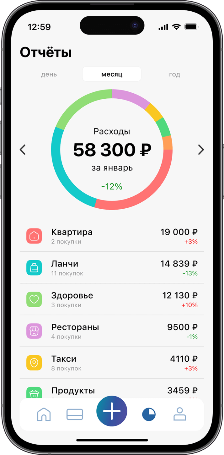 «Отчёты» — самый полезный раздел для анализа финансов. Здесь показываем динамику и считаем покупки в отдельных категориях.