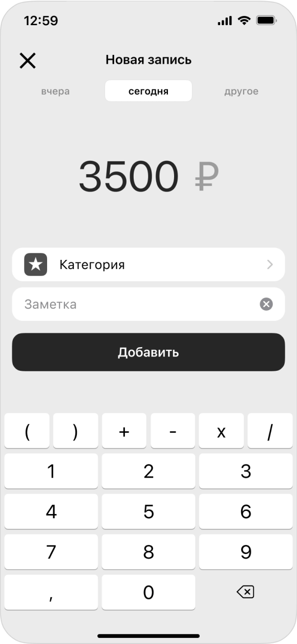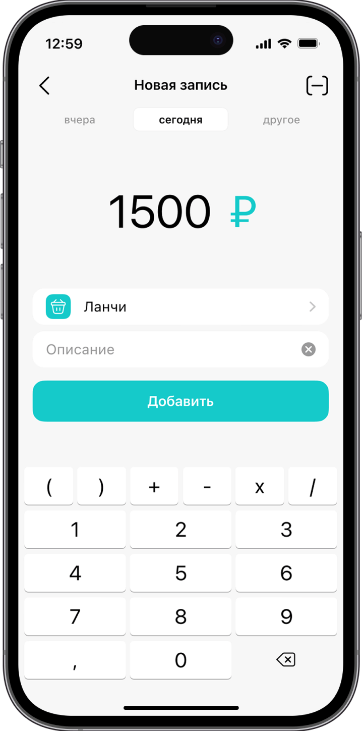 На экране новой записи крупная цифра и цвет категории помогают правильно ввести данные. А ещё добавили в клавиатуру калькулятор, а в правый угол — кнопку сканирования чеков.