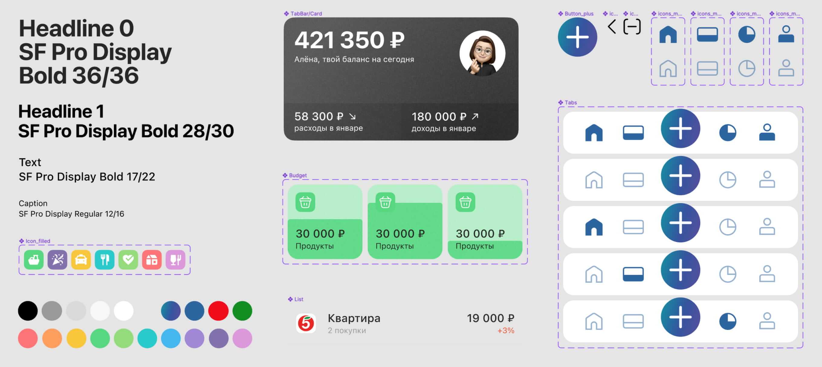 Нам было интересно собрать приложение максимально похожее на готовый к разработке продукт. Поэтому все элементы дизайна фиксировали в UI-ките: возможные состояния иконок и меню, цвета, типографику и компоненты.