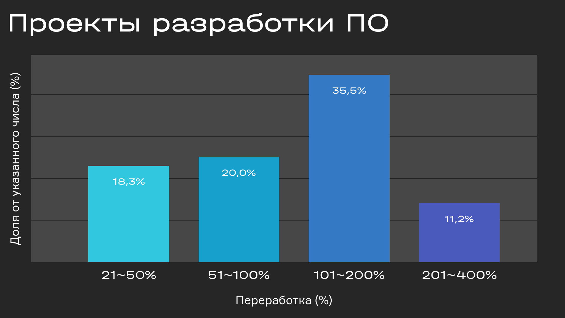 Проблема с высчитыванием времени по списку требований заключается в том, что ваши подсчеты, скорее всего, будут неверными. Согласно докладу «Стэндиш групп», более 83% ИТ-проектов сталкиваются с различными проблемами, то есть не выполняются строго по составленному заранее плану. Как и показано на диаграмме ниже, большинство подобных проблем связаны с перерасходом времени.