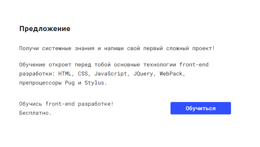 Разработчики нужны всегда. Найти готовых с нужным уровнем — трудно. В 2016 году мы решили сделать бесплатную программу, чтобы человек в ней был заряжен на рост, и потом приходил уже уверенным в себе джуниором. Она открыта для всех на сайте, длится 6-8 месяцев и состоит из пяти заданий. Разбираешься в коде, верстаешь сайт, собираешь единый проект и отправляешь на ревью разработчикам. Если всё ок, то собеседование, трудоустройство.