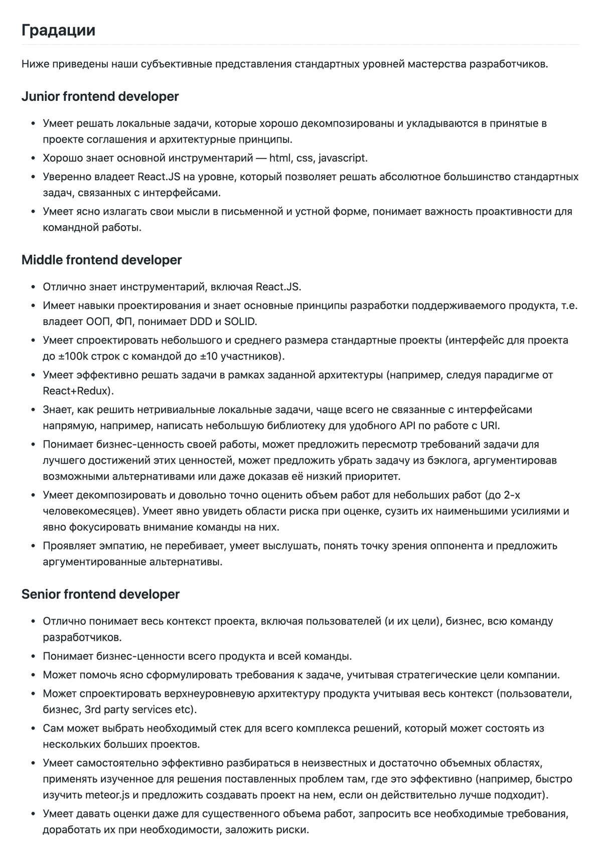 Критерии людей, которых мы пускаем внутрь, чётко разграничены по таблице грейдов. Кандидат заполняет бланк со скиллами и проходит техническое интервью: я проверяю его таблицу, соотношу данные с реальностью. Как правило, это негативный сценарий. Хороший вариант — когда я прошу: «Расскажи про интересный проект», спрашиваю: «Что тебе нравится в твоей работе?», и человек азартно рассказывает — не остановить. Завязывается свободный неформальный диалог с углублением в технические детали — это уже не допрос, как на уроке в школе. Без увлечённости в нашей сфере плохо: недавно расстались с джуном, который пришёл в программирование только потому, что «здесь много денег». А когда приходят ребята-идеалисты, пусть и малоопытные, но им важно, интересно, огонёк в глазах, то стараемся заметить и «поймать» такого человека.