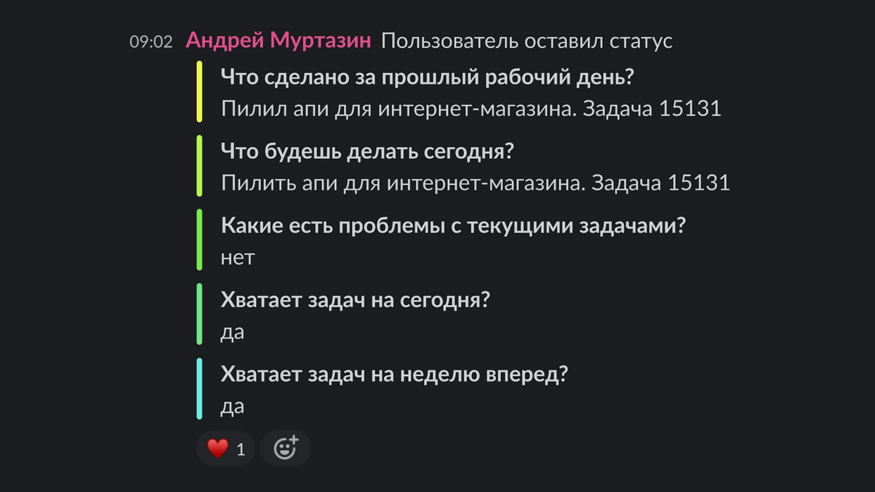 Помогают и другие инструменты контроля и «сверки часов» с ремоутерами: DigitalWand разработала свой митап-бот, задающий разработчику с утра пять вопросов по текущим статусам.