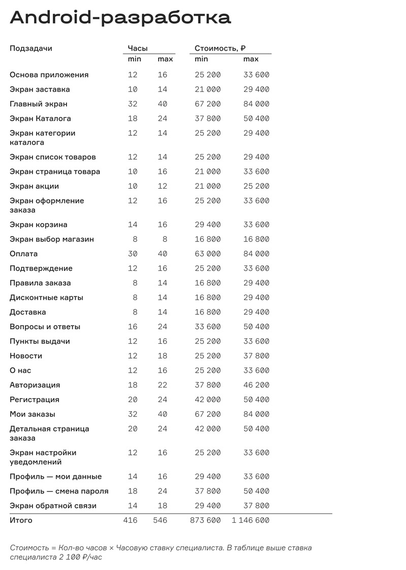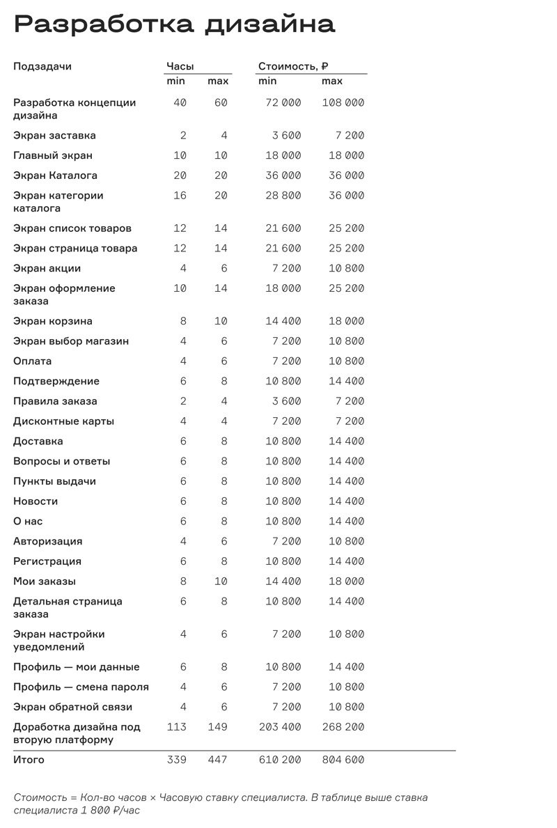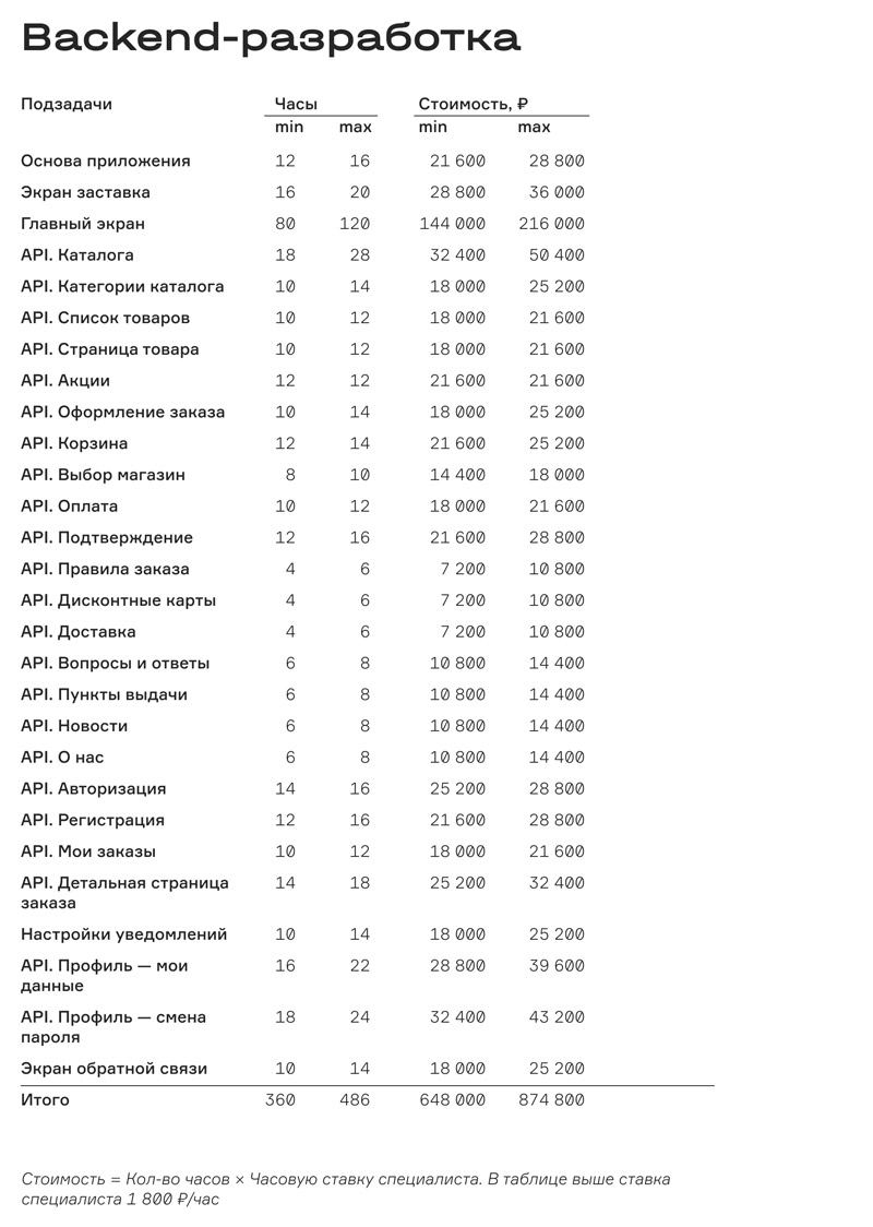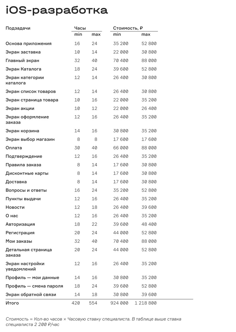 Если свести это к общей формуле, то получится: n1*x1 + n2*x2 + n3*x3 = y. Здесь n — количество рабочих часов, x — стоимость работы специалиста, y — итоговая сумма. Количество слагаемых зависит от необходимого числа работников: на это влияет уровень сложности приложения и срочность.