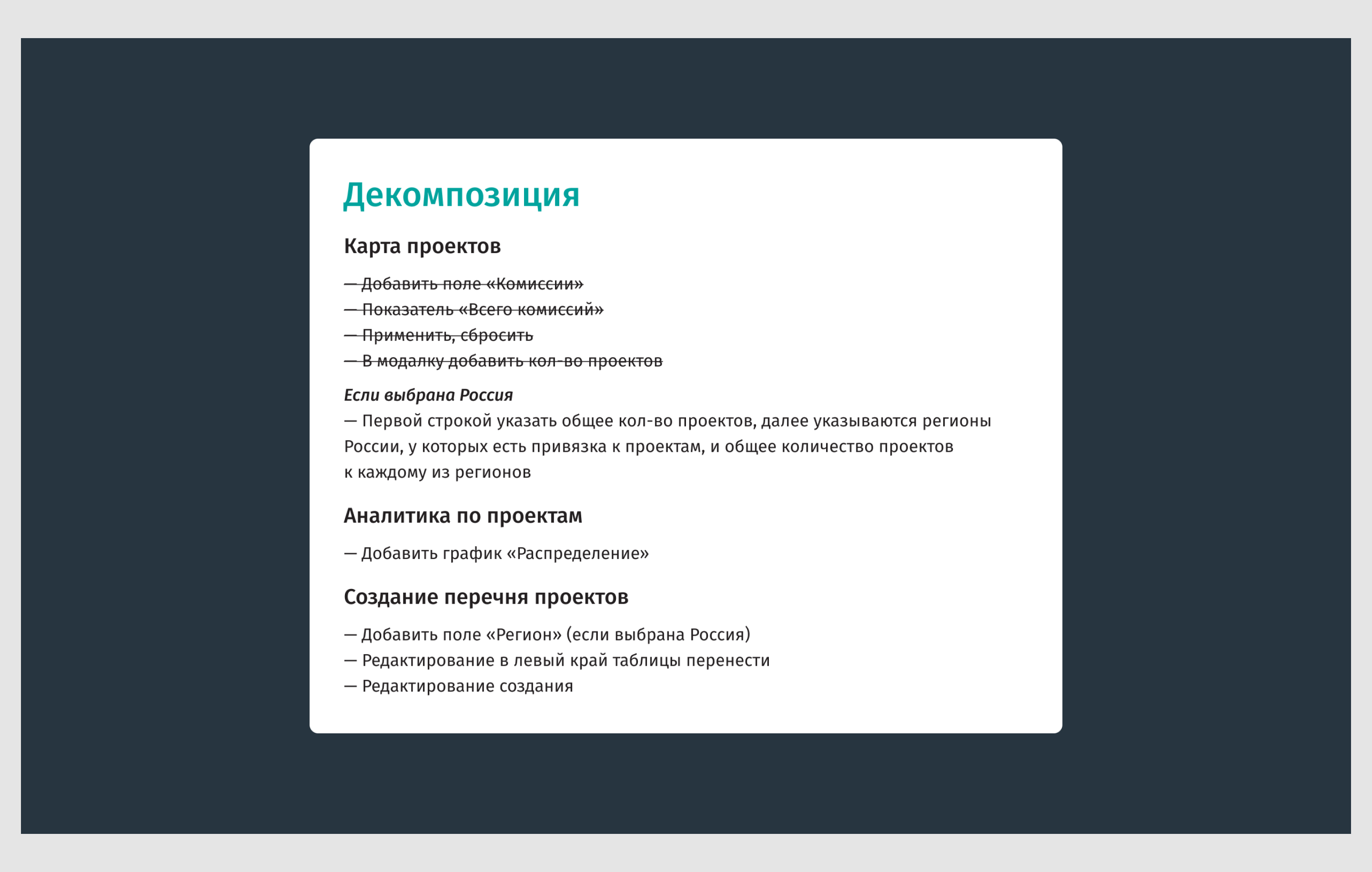 Также рядом с макетом мы декомпозируем задачу, разбивая её на небольшие и понятные подзадачи. Приём «записать всё, чтобы ничего не пропустить» хорошо помогает как в начале работы над задачей, так и в процессе правки правок.