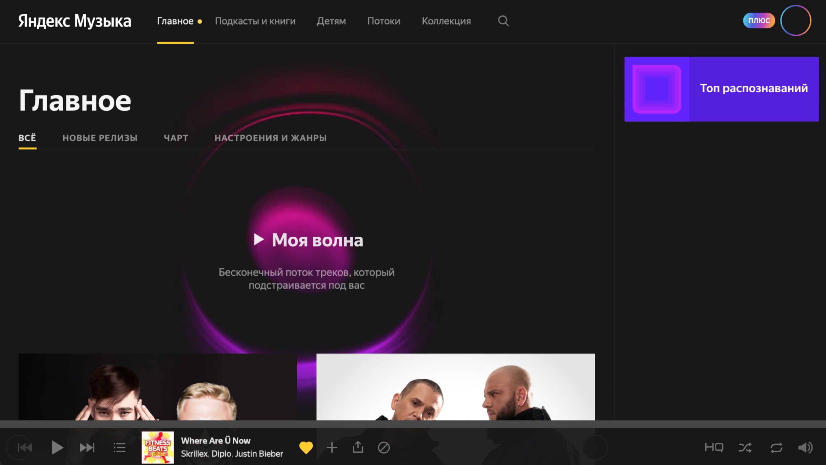 Центральный блок на главном экране остался без значительных изменений. Сохранили акцент на преимуществах сервиса: «Моей волне» и ежедневных рекомендациях.