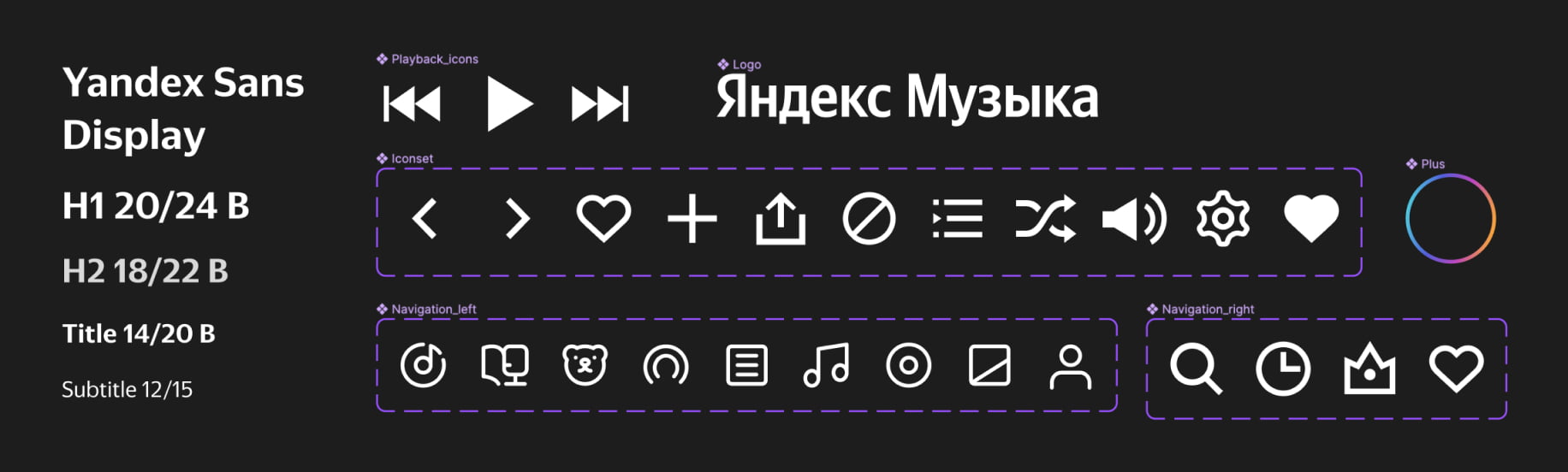 Собрали ключевой визуал бренда Яндекс Музыки — логотипы, иконки и фирменный шрифт. Использование этих элементов позволяет сохранить айдентику приложения.