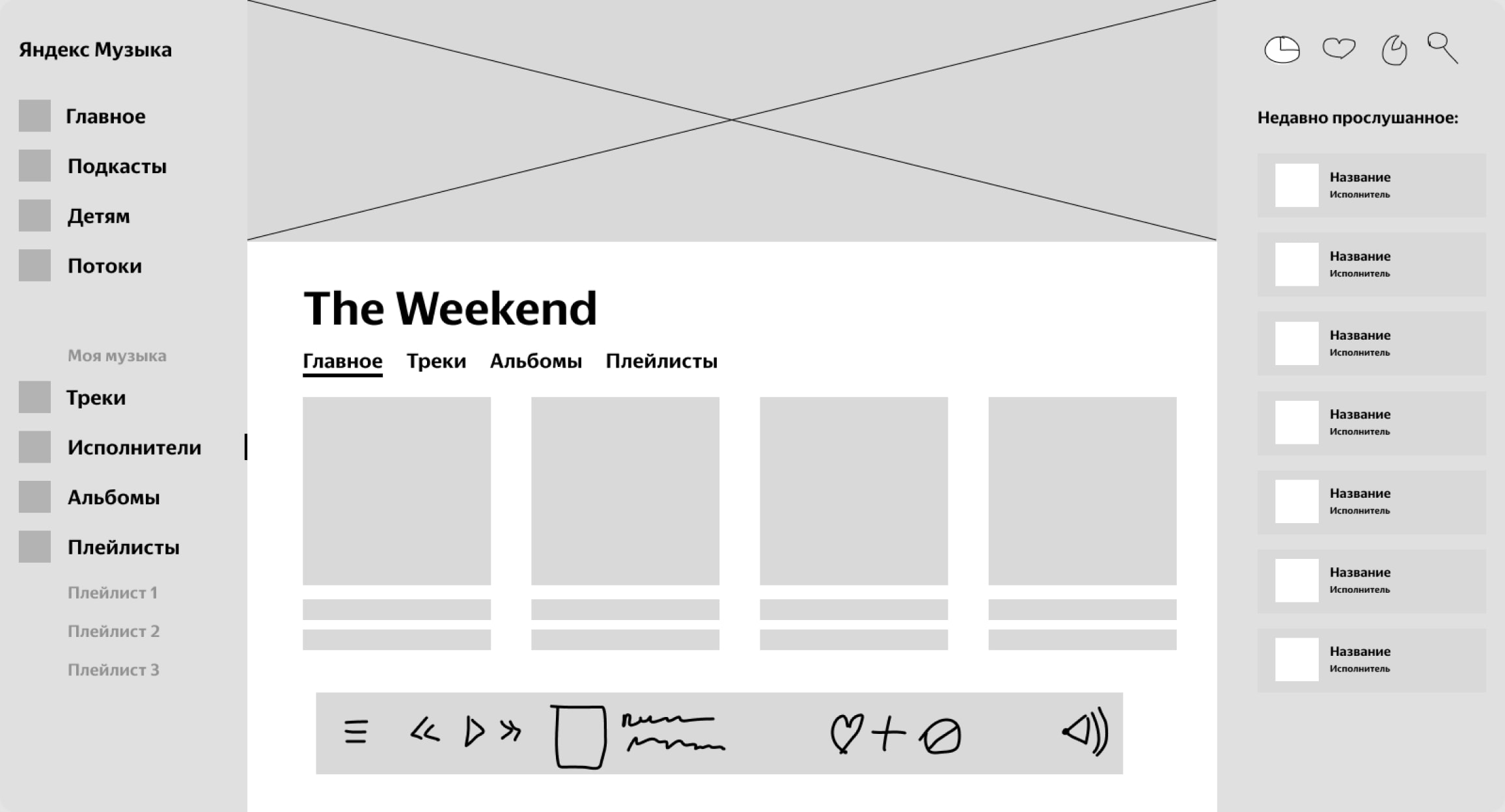 Дополнили его навигационными элементами. Левая панель перемещает пользователя по рубрикам сервиса и даёт быстрый доступ к личному каталогу музыки. Блок справа отображает историю прослушиваний, последние лайки на треках и топ за неделю по всем пользователям.
