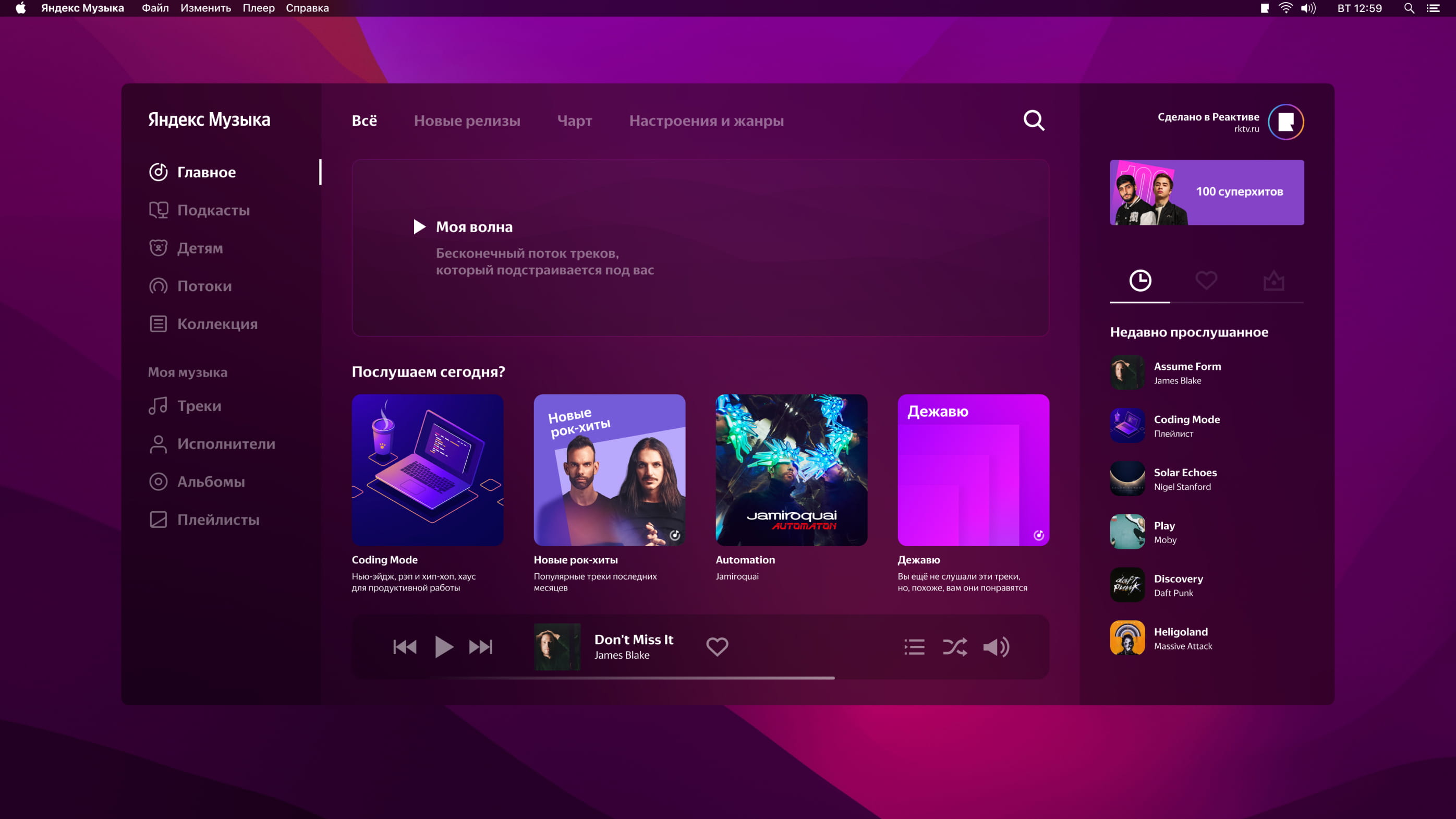 Самые популярные приложения музыки на MacOS — Apple Music и Spotify. Элементы там расположены плотнее, чем в веб-версии Яндекс Музыки. Такой приём позволяет предложить пользователю больше контента.