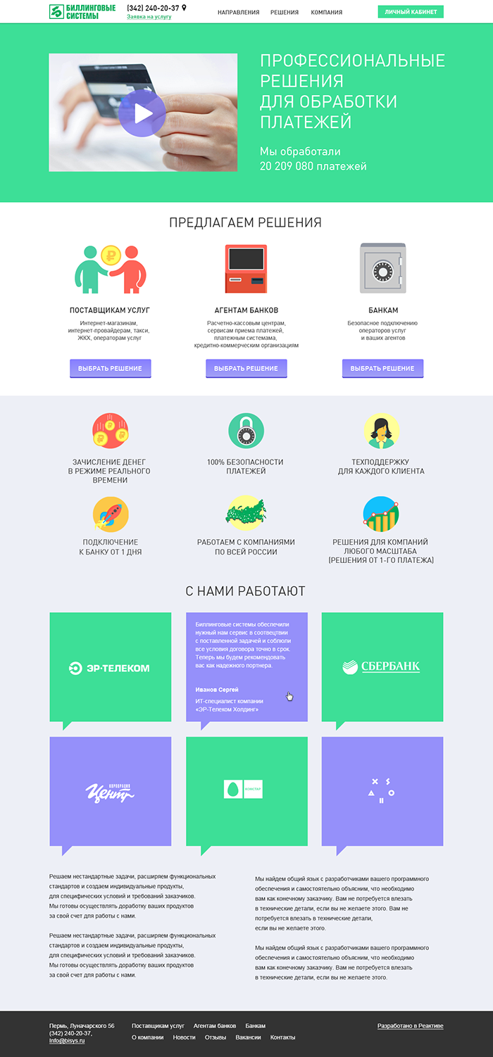 Мы постарались просто и понятно рассказать о сложной деятельности. Все многообразие финансовых решений заказчика разложено по полочкам и предложено разным видам клиентов в удобной для выбора форме. С любой страницы можно заказать обратный звонок и подключение выбранной услуги.