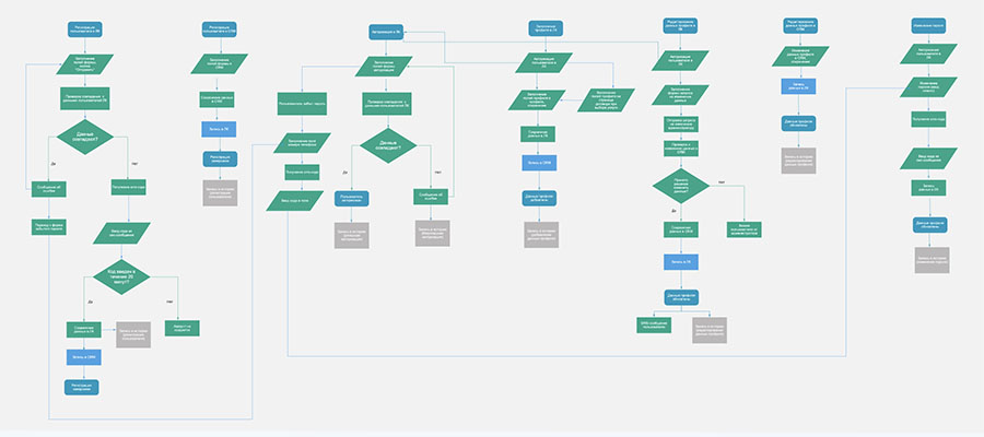 По итогам анализа разработали схемы процессов, которые было необходимо реализовать в личном кабинете. Сразу скажем, что в процессе работы их пришлось редактировать, но в целом такое графическое описание дало нам общее понимание взаимодействия и объект обсуждения с клиентом.
