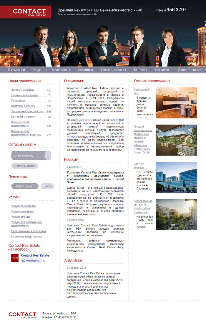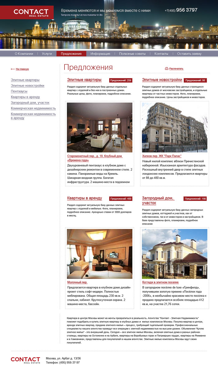 Агентство Contact Real Estate оказывает услуги по покупке и продаже элитных квартир, апартаментов, пентхаусов в Москве, а также загородных домов и коттеджных поселков в Подмосковье.