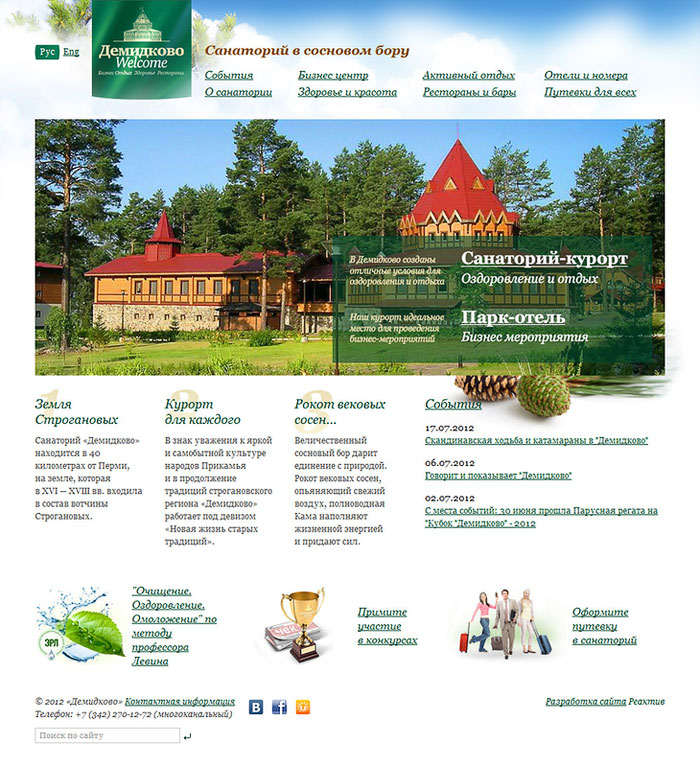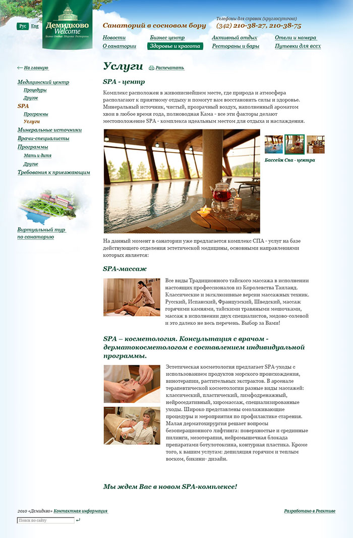 Подробно описали услуги курорта, разбив их на четыре основных группы. Разместили фотогалереи. Дали информацию о ценах. Сделали форму бронирования номера. Для иностранных гостей разработали английскую версию сайта.