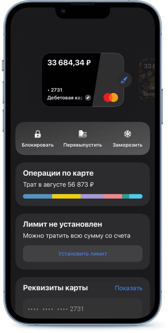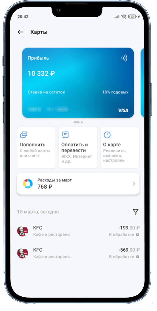 Реактив сделал так, чтобы всё корректно отображалось и работало. Верстали страницы карты в приложении и добавили её анимацию. Разрабатывали механизм шифрования и дешифрования, чтобы данные клиентов оставались в безопасности. Без этого же механизма пользователь не смог бы посмотреть в приложении номер и CVС карты.