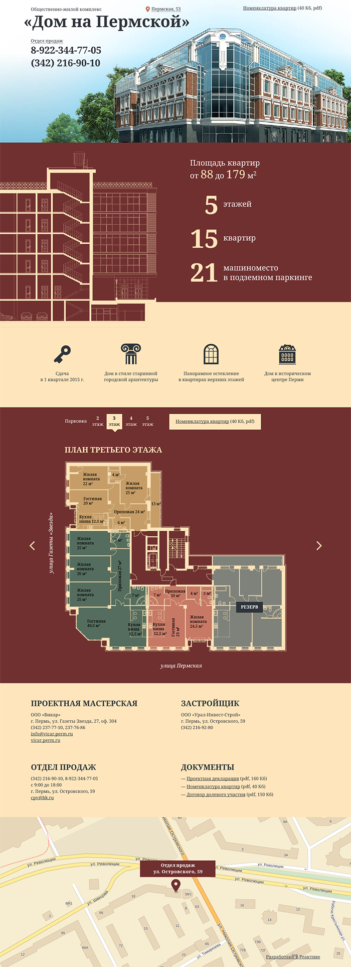 Мы разработали компактный одностраничный сайт, на котором удалось разместить множество полезной информации для будущих покупателей квартир. На сайте тезисно выделены ключевые преимущества дома, даны подробные планировки всех этажей, показаны свободные и занятые квартиры. Крупно показаны контактные телефоны отдела продаж, даны документы для скачивания.