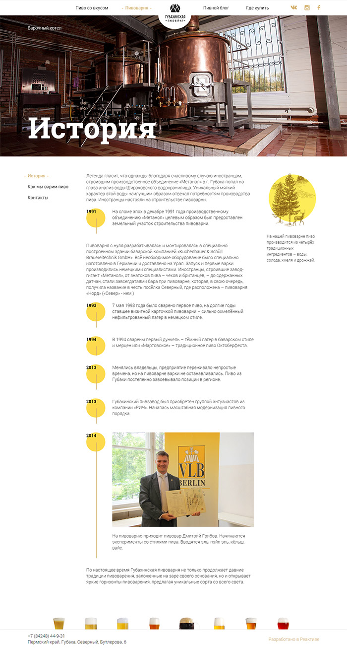 История пивоварни насчитывает уже несколько десятилетий. На сайте подробно описаны этапы процесса производства.