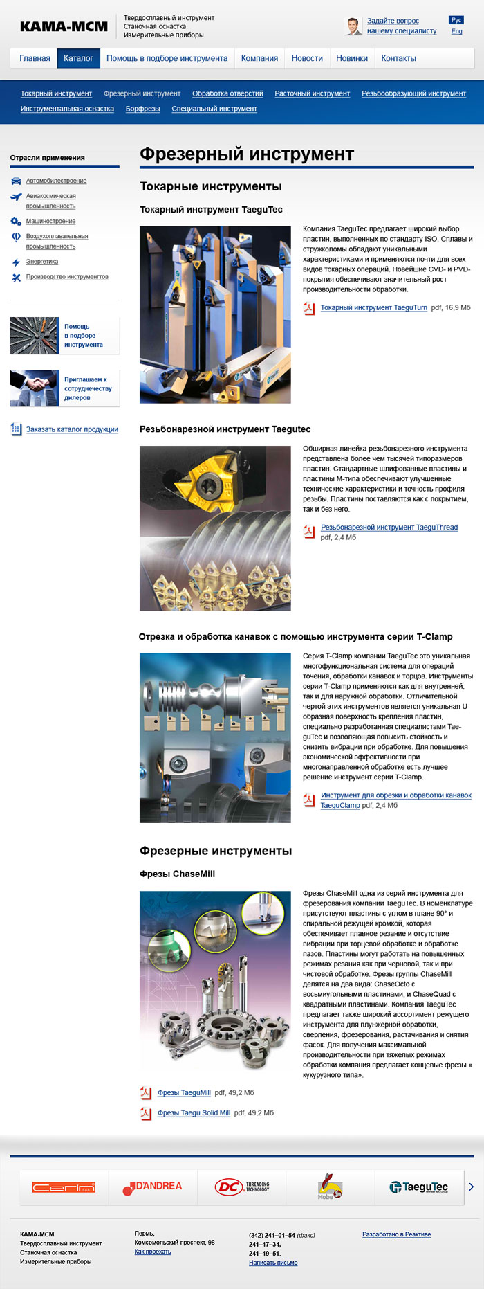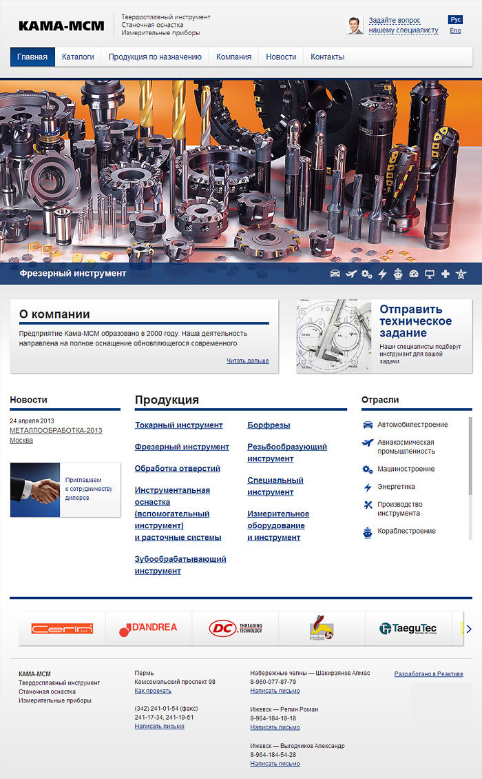 Разместили каталоги предлагаемого оборудования, разбив их по производителям и назначению. Создали контактную форму, форму отправки технического задания для оценки и контактную форму для потенциальных дилеров.