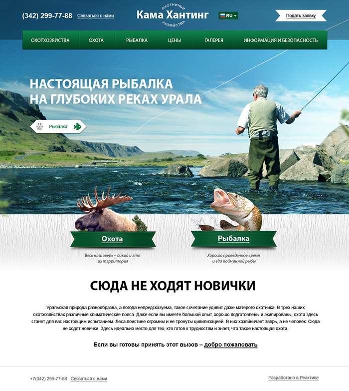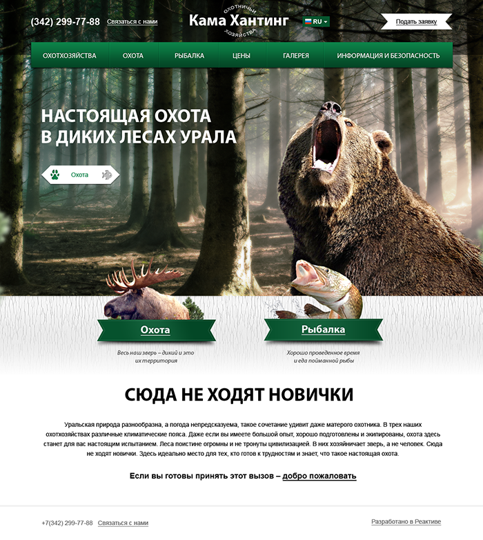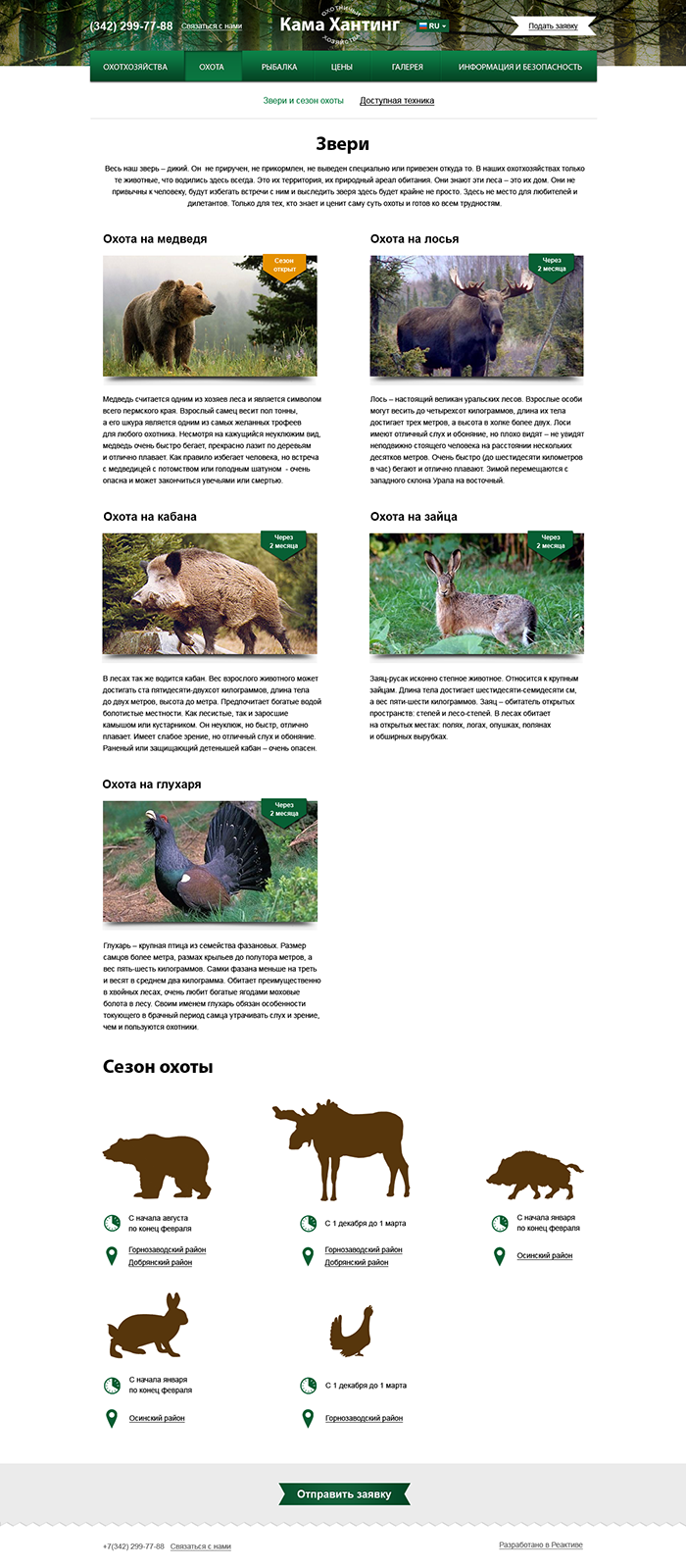 Разработать сайт для привлечения любителей охоты и рыбалки по всей России в охотхозяйства Пермского края.