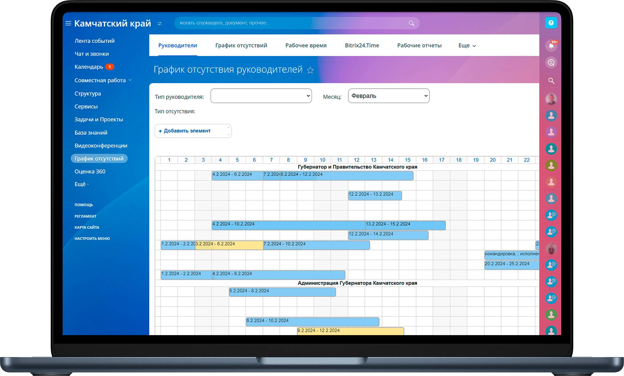 Сотрудники Правительства Камчатского края, органов исполнительной власти и подведомственных учреждений используют для работы сервис Битрикс24. С его помощью они организуют все процессы: ставят задачи, контролируют проекты, планируют встречи, ведут рабочую переписку и т.д.