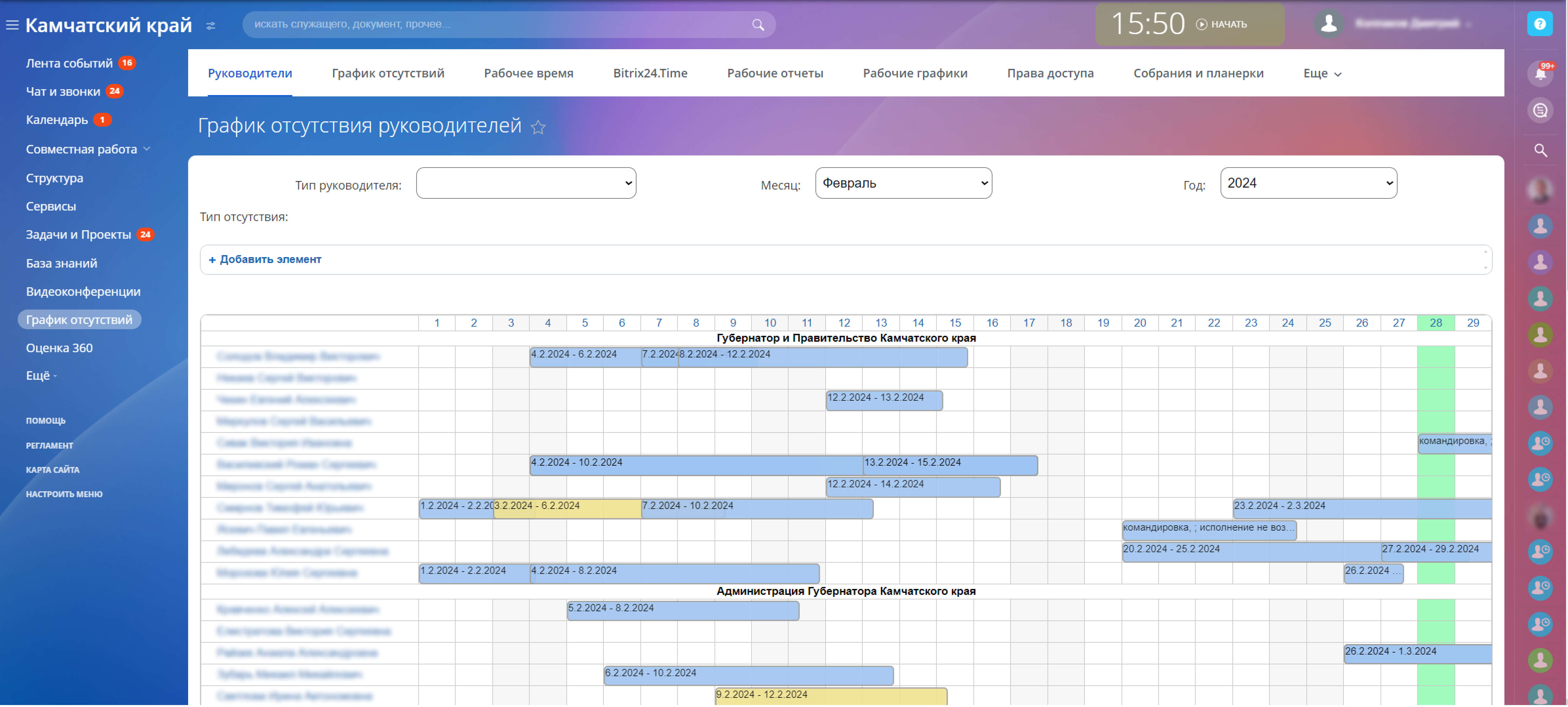 У пользователей системы была потребность в наглядном отображении отпусков, больничных и командировок руководителей. Информацию представили в формате таблицы: строки — это сотрудники, сгруппированные по органам власти; столбцы — номера недель в году. На их пересечении визуально отображается период отсутствия руководителя на рабочем месте. Чтобы посмотреть график в конкретный месяц и год, нужно воспользоваться фильтром.