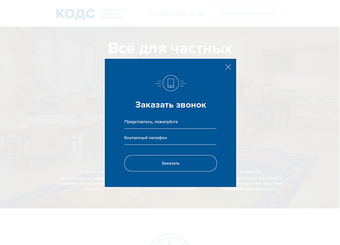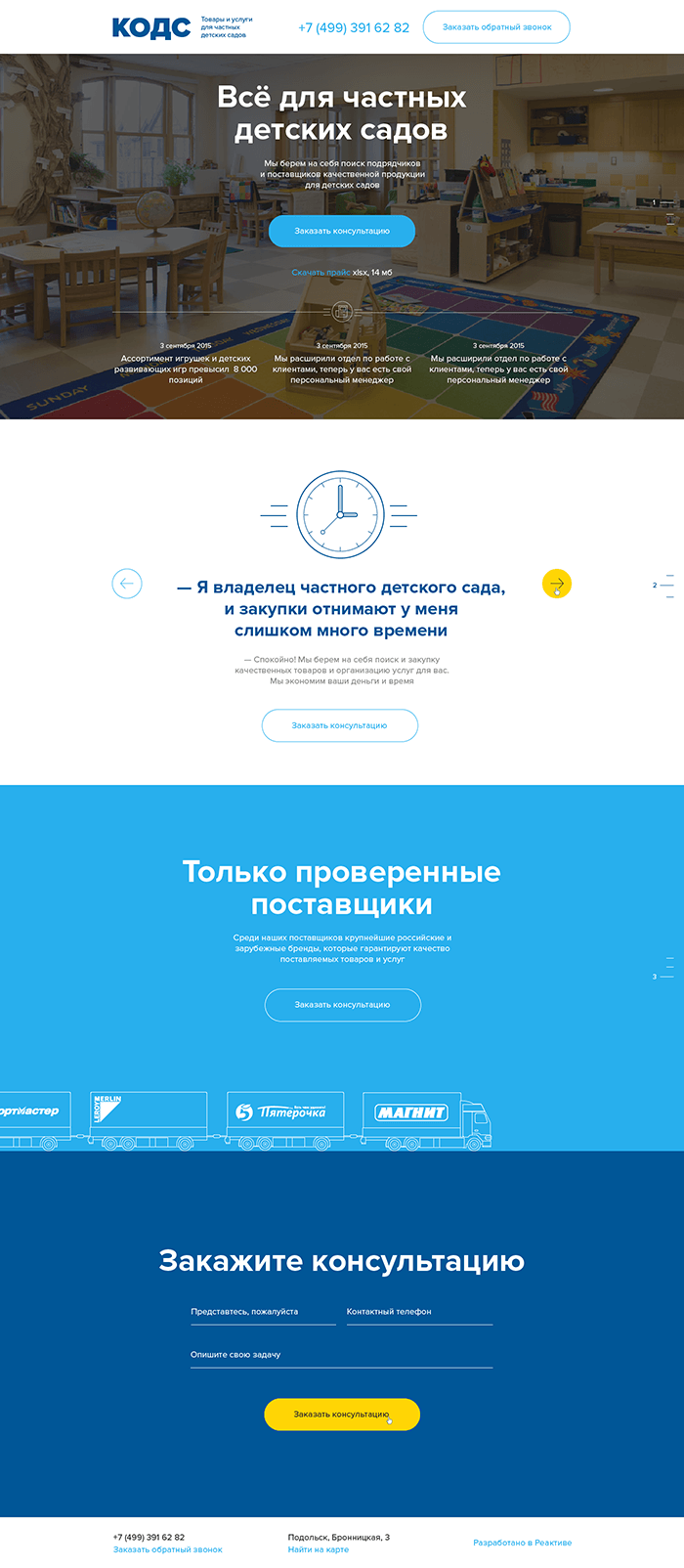 На первом экране кратко подана суть предложения компании, есть возможность скачать цены, а также опубликовать краткие новостные сообщения. На следующем экране предложение раскрывается более подробно, указаны наиболее вероятные проблемы связанные со снабжением детских садов и даны способы их решения. Тексты сопровождаются анимированными пиктограммами и ссылкой на форму заказа консультации.
