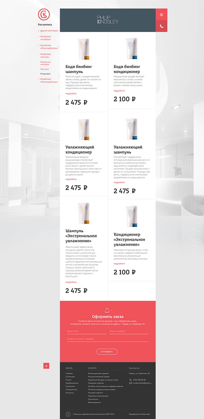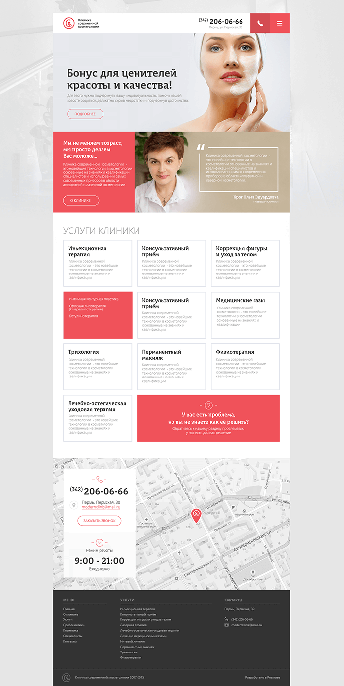 Пациентами косметолога бывают в основном женщины. Поэтому создавая сайт для клиники, мы в первую очередь ориентировались на них. Как женщины принимают решение о том, что им пора обратиться к косметологу? По-разному. Кто-то не новичок в области косметологии и очень четко знает, что хочет. И даже терминами специальными бегло оперирует. Для таких — полный перечень услуг на главной и в разделе «Услуги».