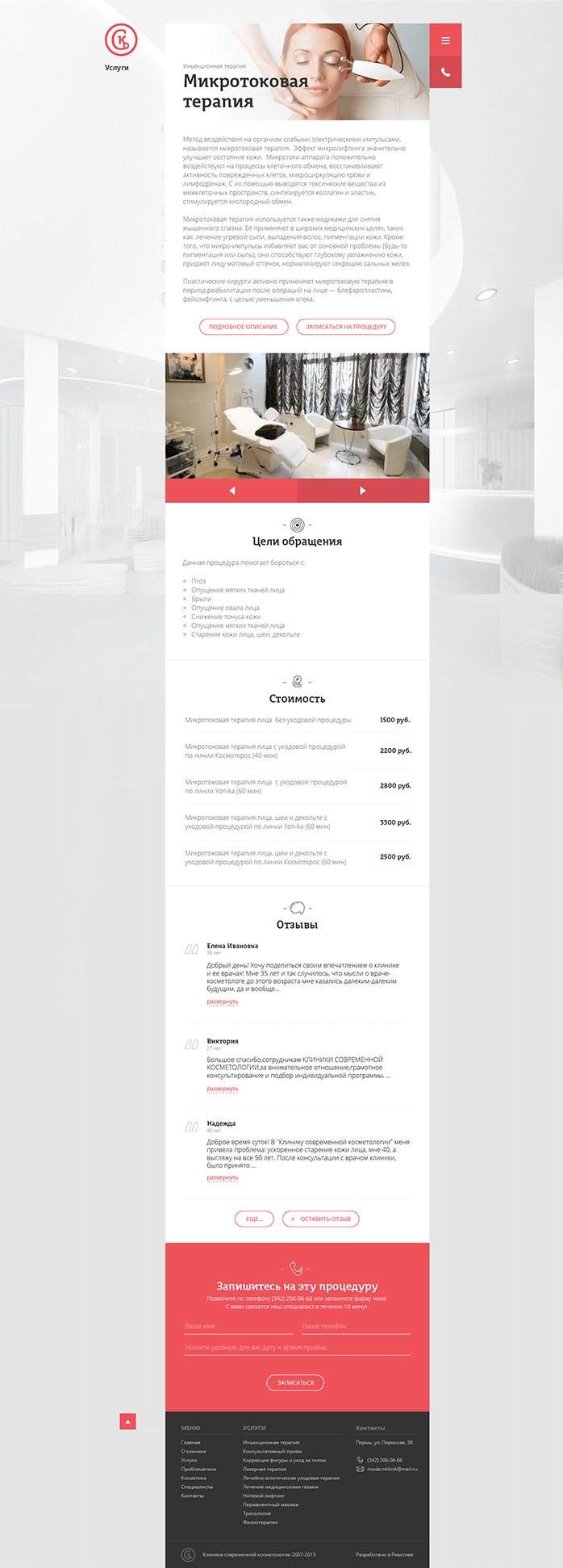 Клиника ничего не скрывает от своих пациентов, поэтому каждая услуга описана очень подробно. Можно прочитать, что происходит во время обращения в клинику, какие препараты используются, и сколько все это стоит. Предусмотрена возможность оставлять отзывы и, конечно же, быстро и удобно записаться на прием с помощью специальной формы заявки.