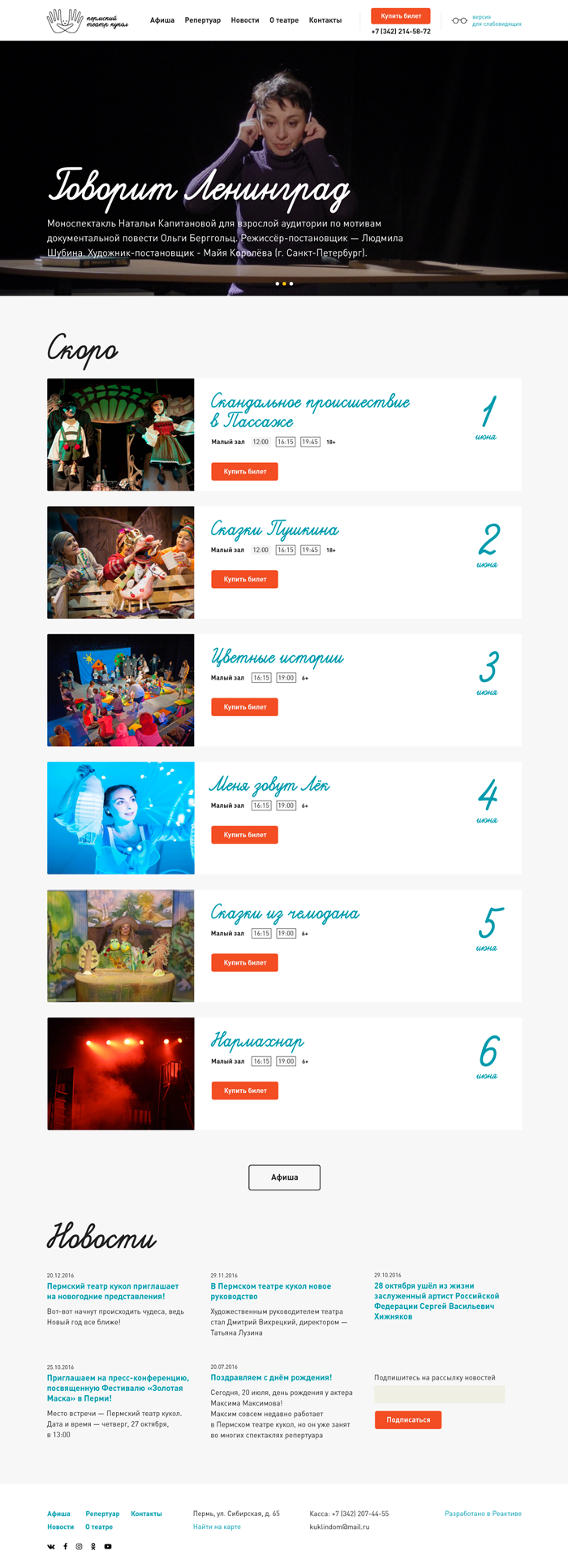 На главной странице промо-блок с премьерами, афиша с ближайшими спектаклями, новости и официальная информация о партнерах.