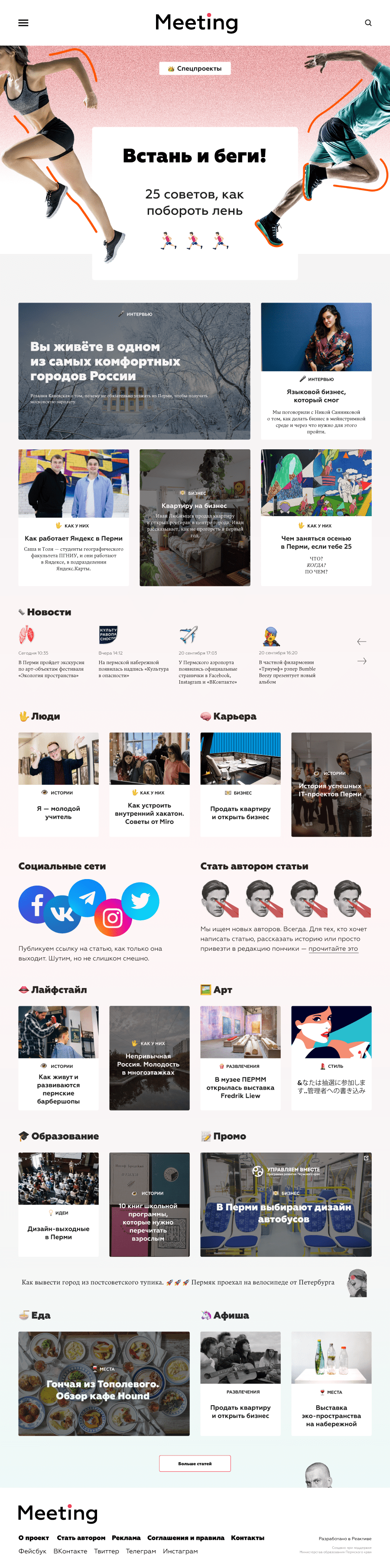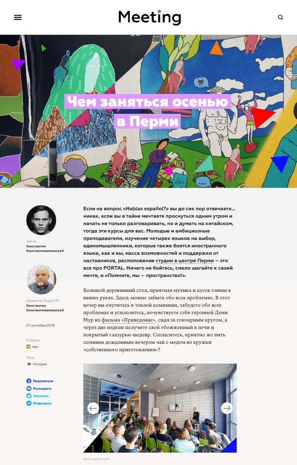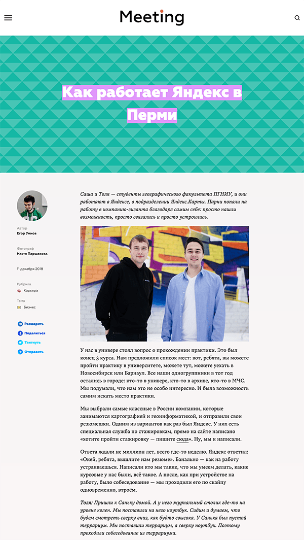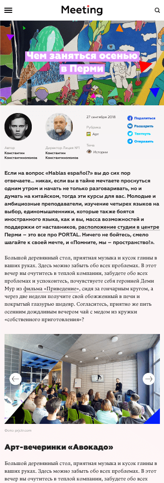 Meeting — интернет-журнал об успешных молодых пермяках, о жизни, возможностях и молодости в Пермском крае. Это место встречи людей, добившихся своего и тех, кто хочет самореализоваться.