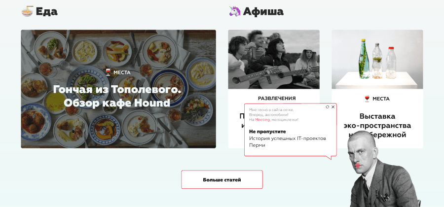 Наша фишечка — стикеры с Маяковским. Владимир Владимирович привлекает внимание к изданию и статьям цитатами из поэмы «150 000 000». В поэме Маяковский призывает на митинг. В нашей редактированной версии — на Meeting.