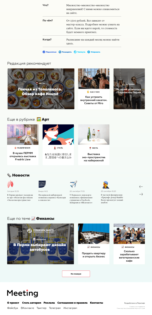Мы рассчитывали, что соцсети станут основным место «посева» статей. Чтобы пользователи не уходили с портала после перехода на статью из ленты в социальных сетях, мы добавили большой блок рекомендованных статей: от редакции, по теме и рубрике.