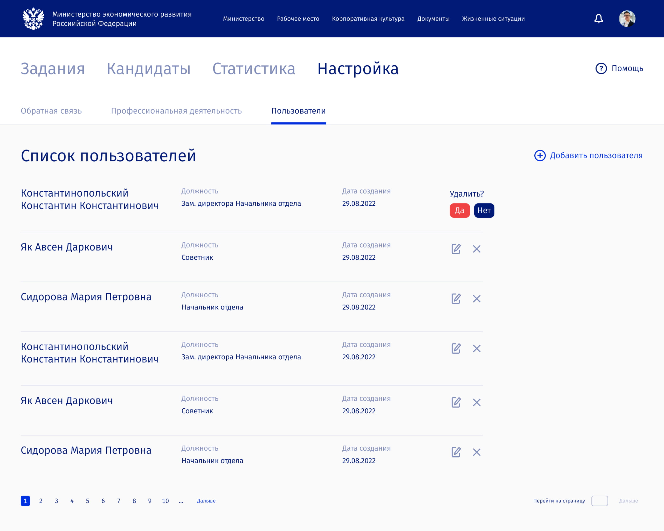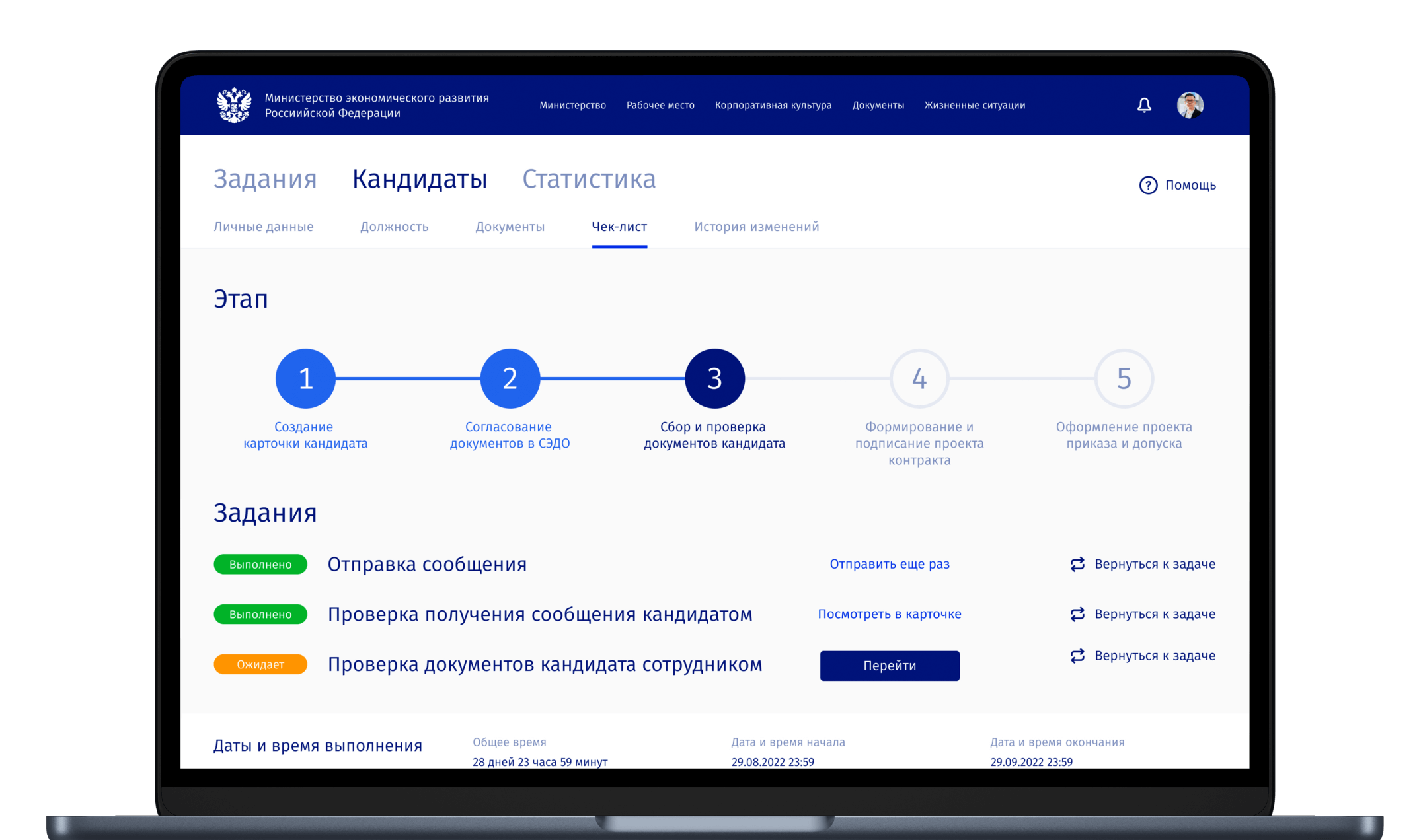 Этот модуль мы доработали, чтобы оптимизировать процесс приёма на работу в Министерство. В том числе, реализовали пошаговую работу сотрудников, которые задействованы в процессе: без выполнения обязательного задания в шаге нельзя перейти дальше.