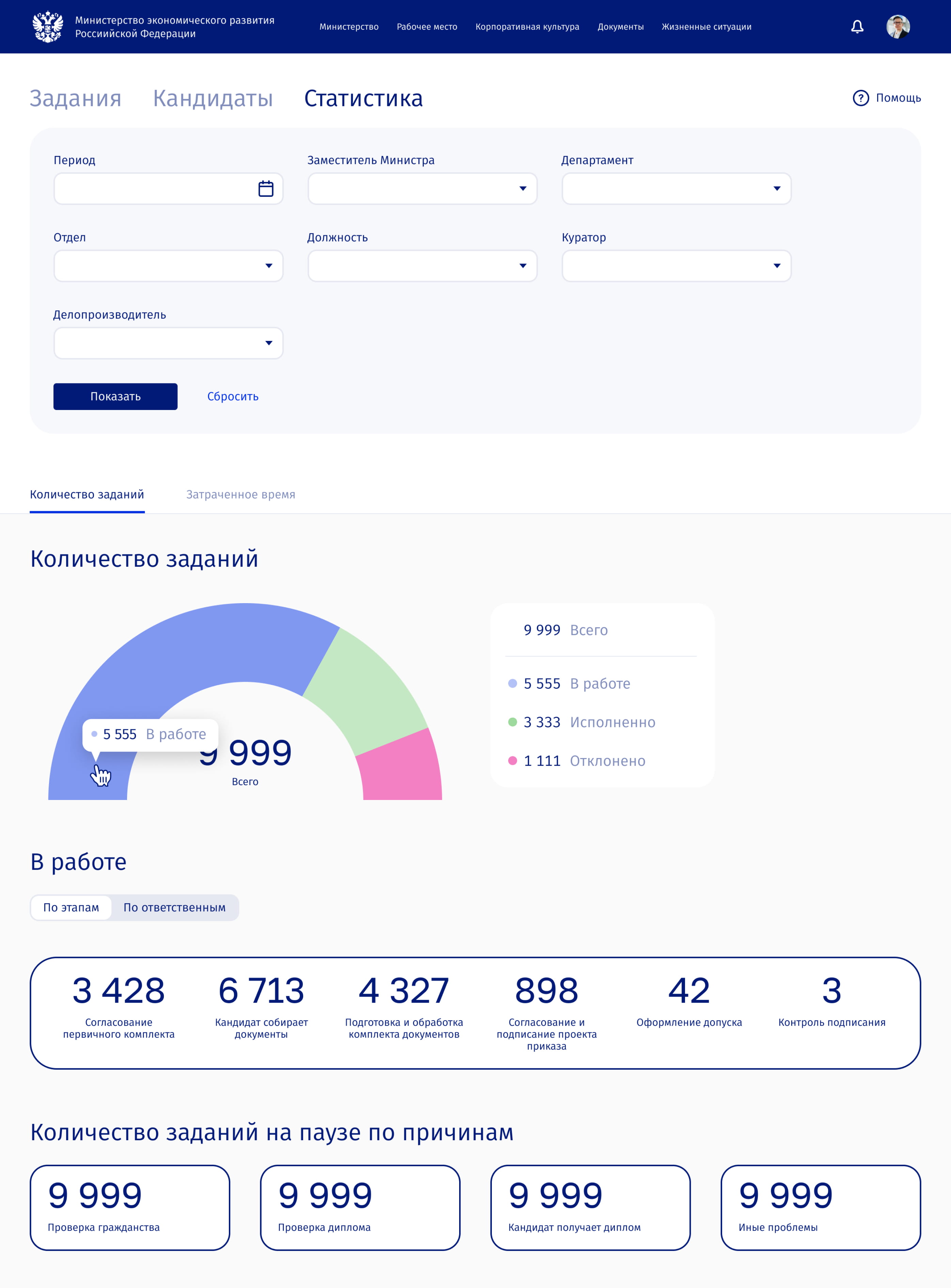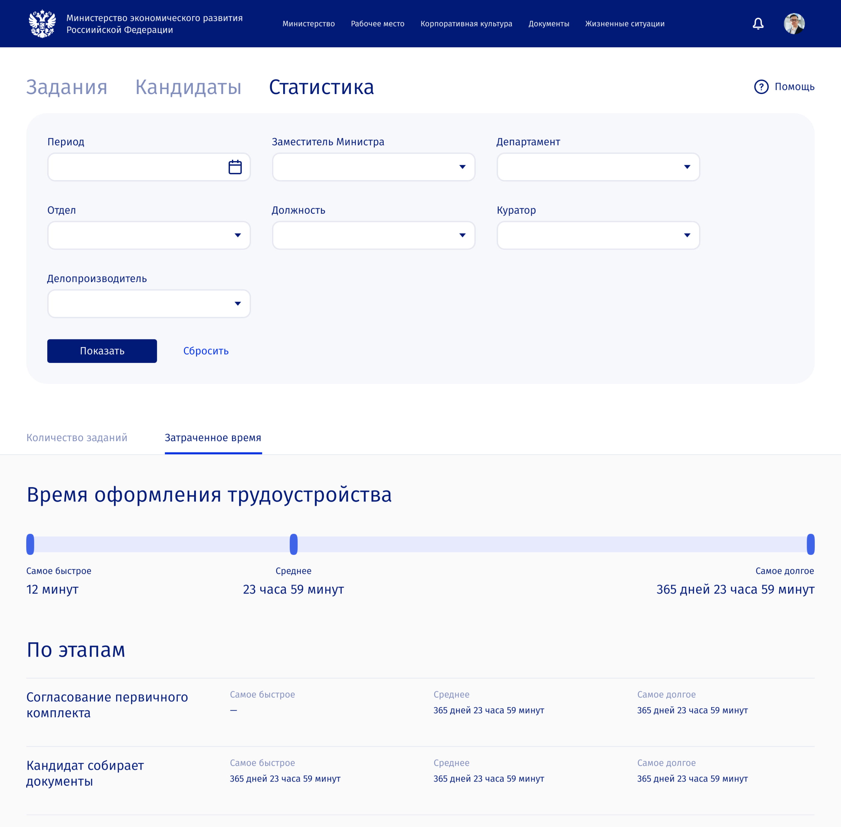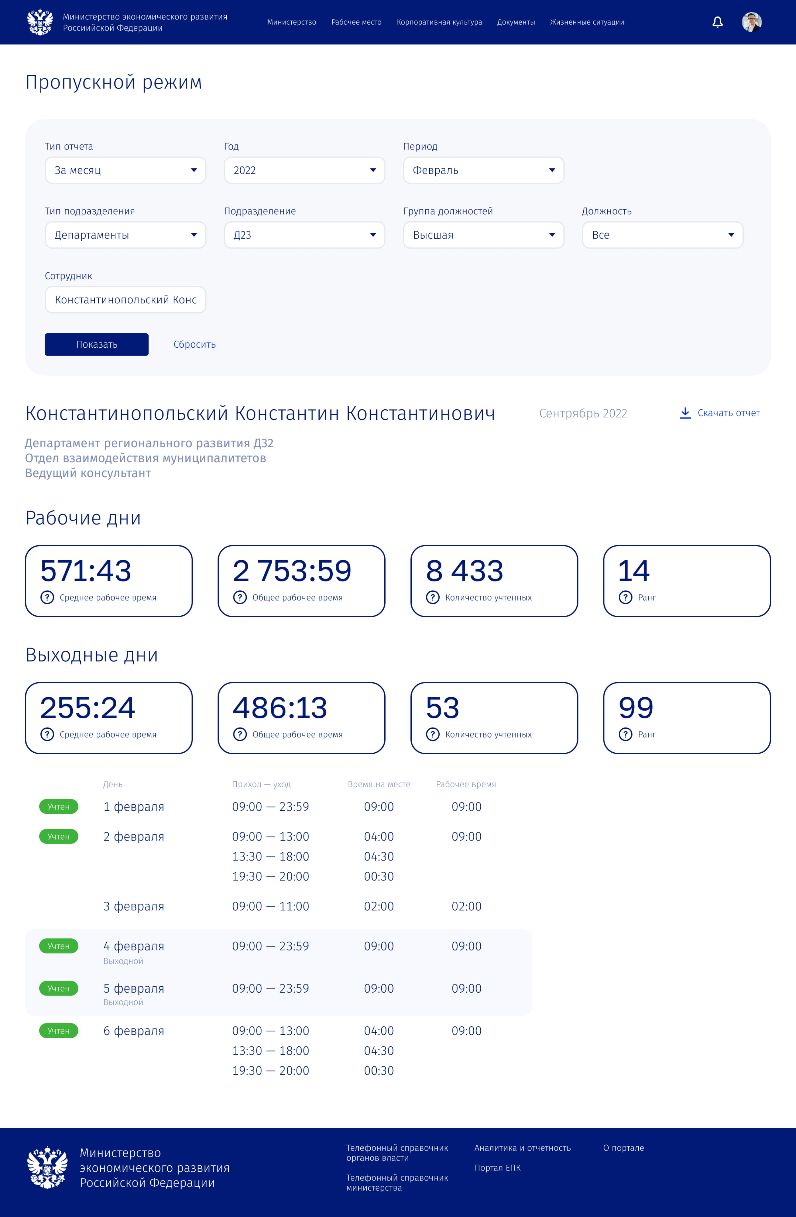 Так как это внутренний портал для сотрудников Министерства, его не найти в открытом доступе. Мы собрали его демоверсию, чтобы показать вам некоторые реализованные решения.