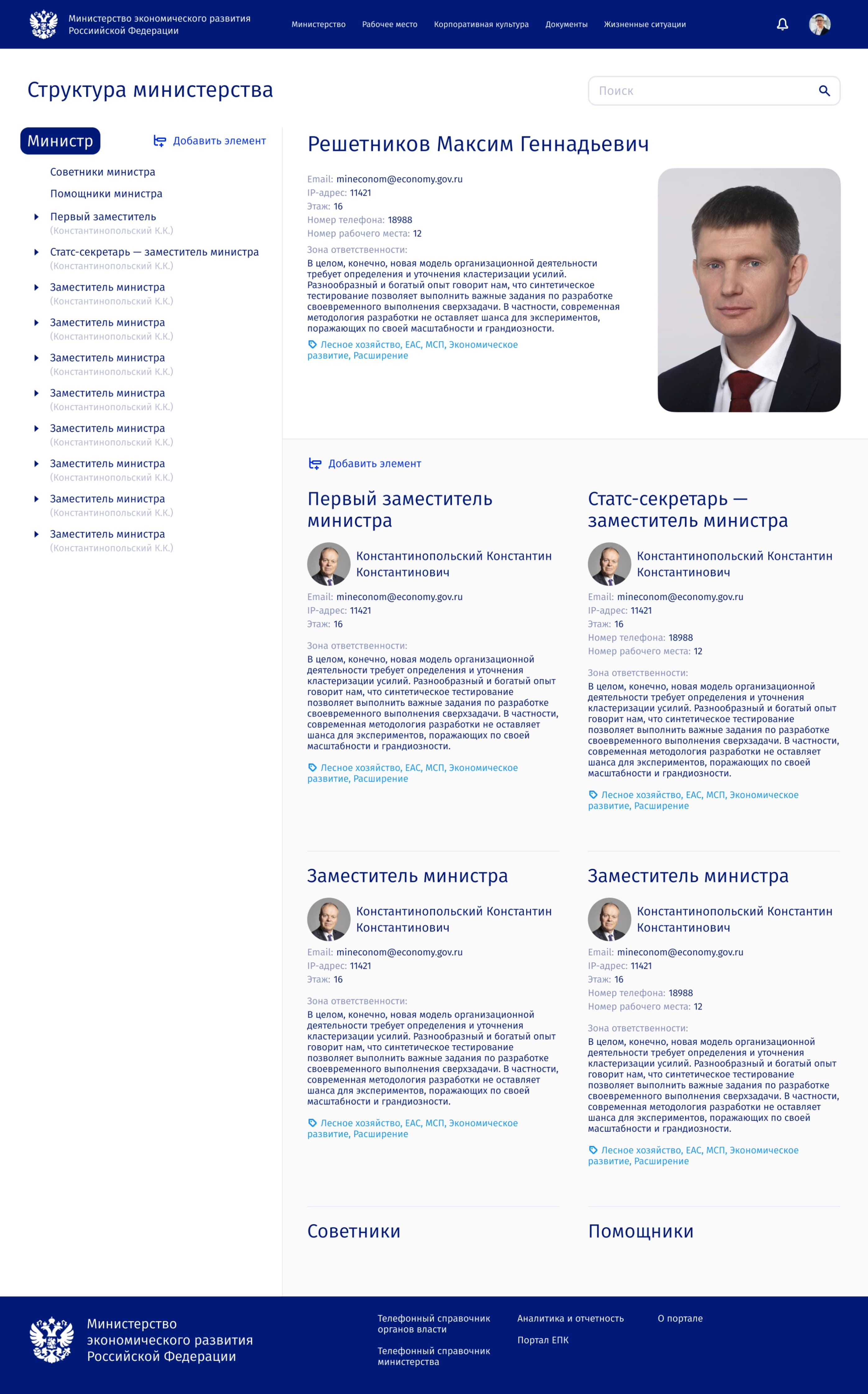 У Минэка — многоуровневая разветвлённая структура с 2500 сотрудников и 36 департаментами и отделами внутри каждого из них. Мы представили её и информацию о каждом элементе в наглядном и удобном для сотрудников виде, реализовали штатное расписание с возможностью привязывать сотрудников к должностям.