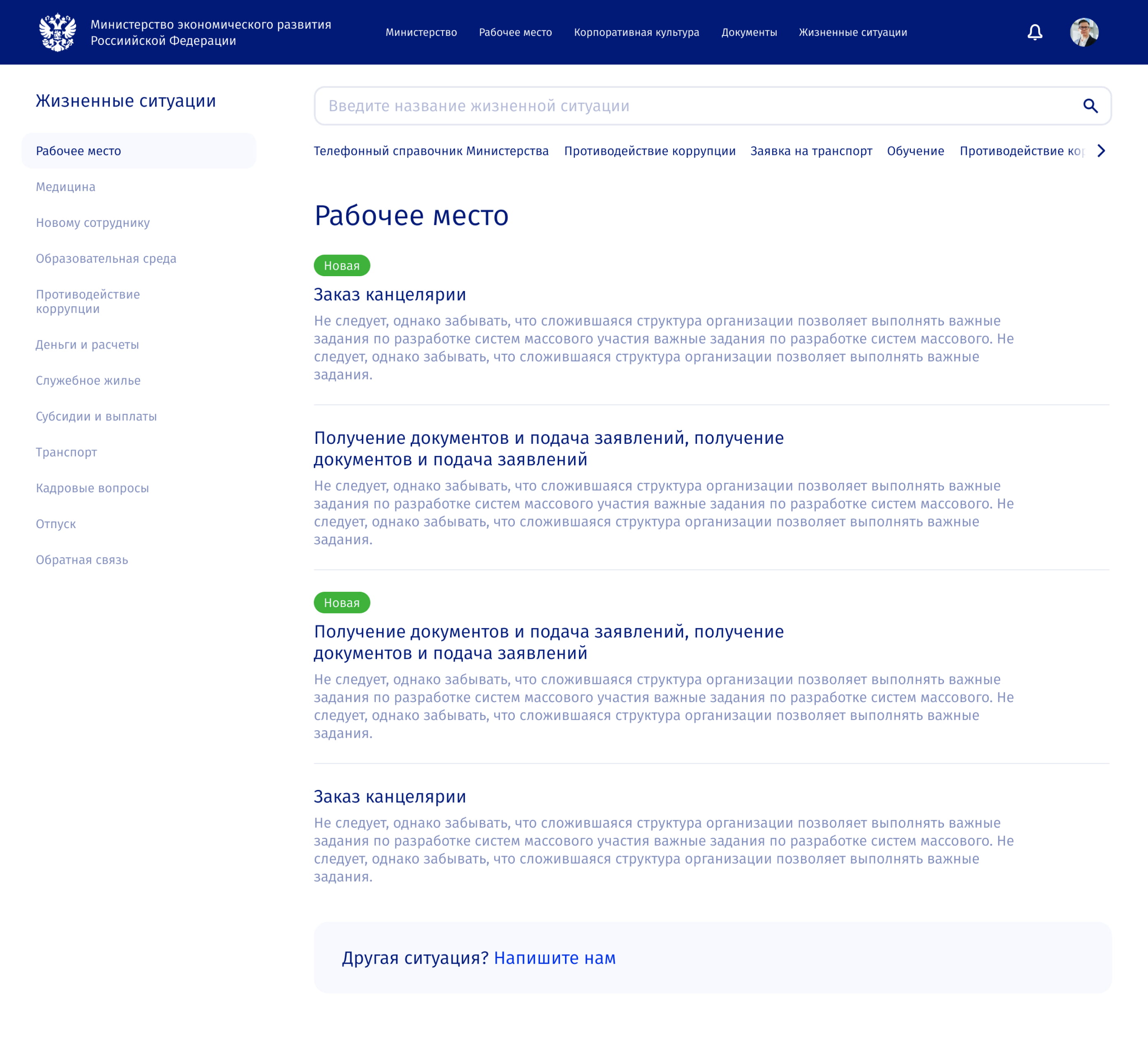 Мы создали базу знаний Министерства, чтобы предоставить сотрудникам полную информацию (порядок, правила, инструкции, ограничения, документация) о действиях в каждой ситуации. Ещё здесь можно отправить заявку для получения обратной связи.