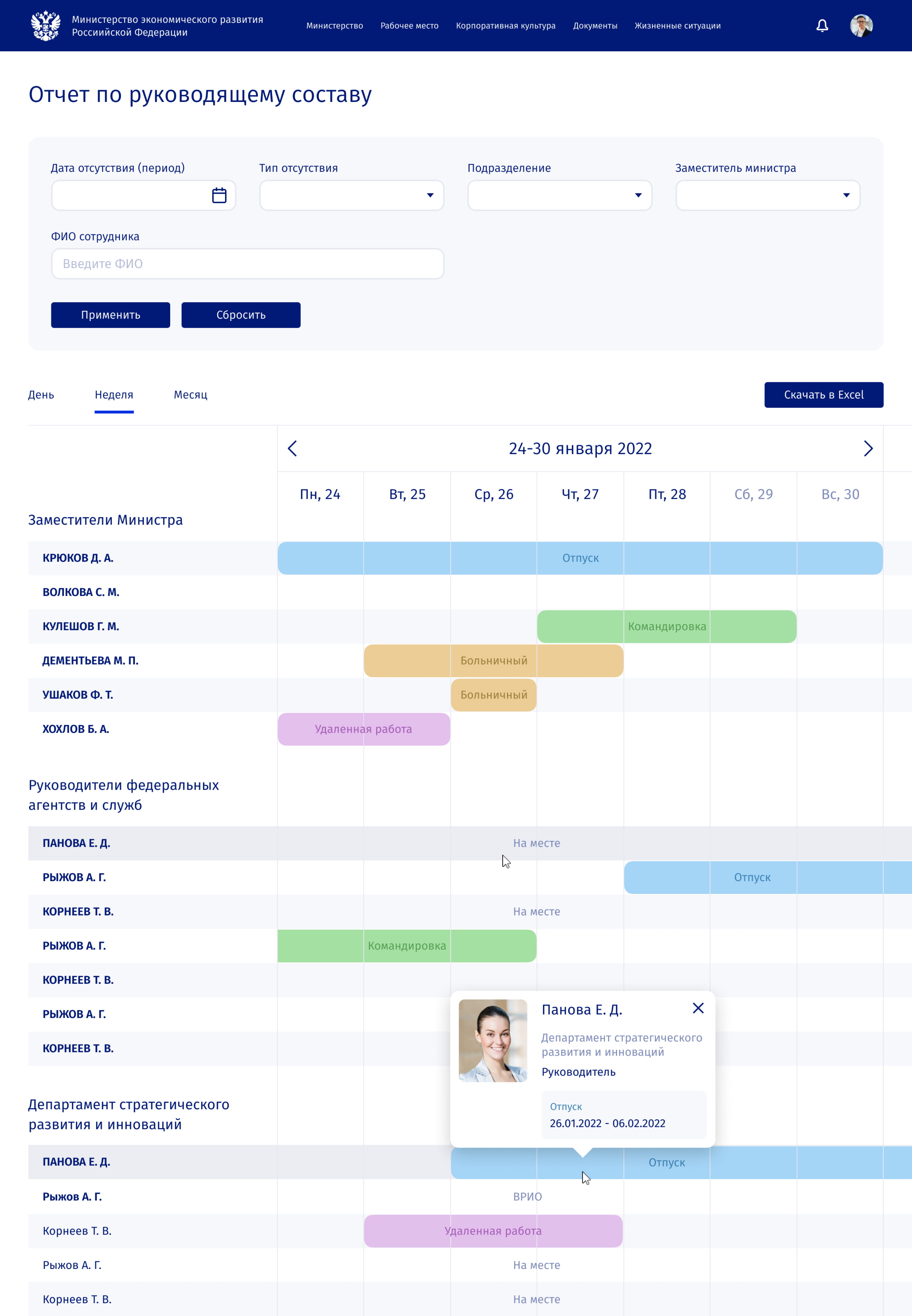 Теперь это отдельный раздел на портале — График отсутствий. У каждого сотрудника руководящего состава есть собственная строка на графике, на которой отмечаются периоды присутствия и отсутствия. Если руководителя нет на месте, временно исполняющий его обязанности отображается визуально.