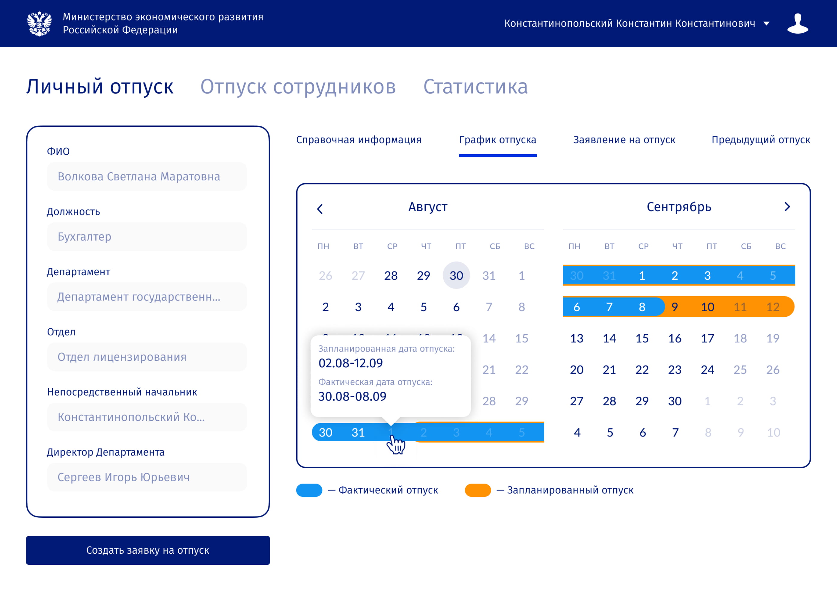 Один из важных разделов, где каждый сотрудник может посмотреть данные по ближайшему и предыдущим отпускам. Для каждого человека система автоматически рассчитывает количество дней, которые остались неотгуленными в этом году. У руководителей отделов дополнительно есть статистика по отпускам подчинённых.