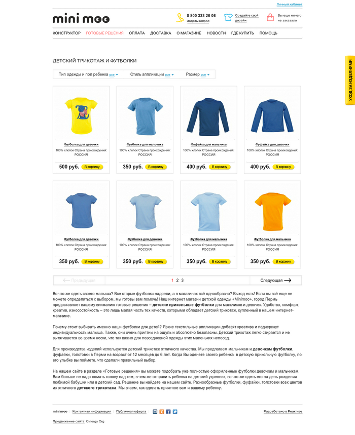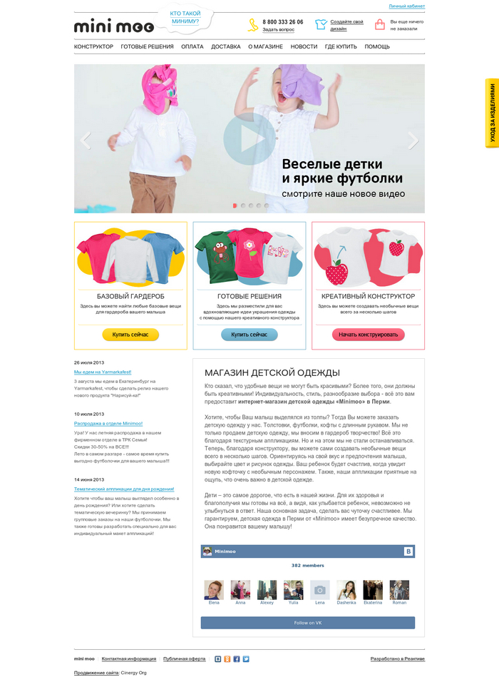 Minimoo — это веселый стартап, позволяющий сделать оригинальную одежду для детей. Наша задача была спроектировать и разработать этот сайт.