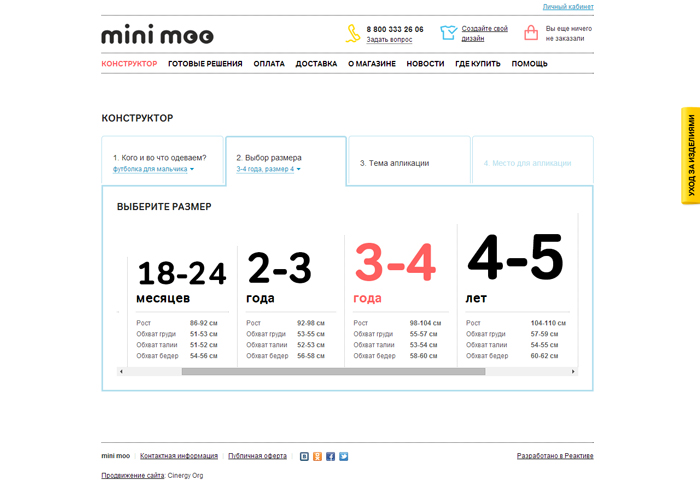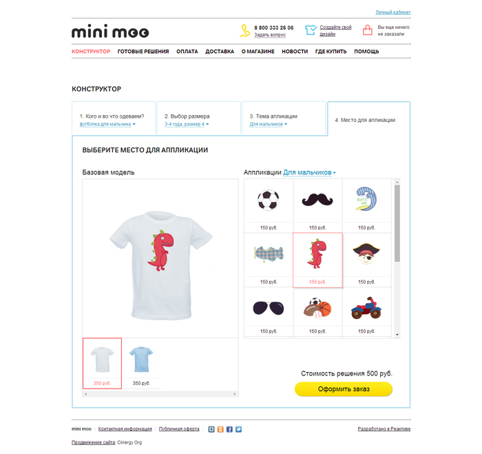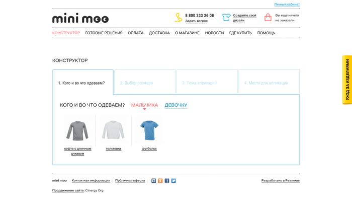 Самый важный раздел сайта — это «Конструктор». Здесь можно выбрать один из множества вариантов одежды, выбрать размер, указав возраст ребенка и нанести на одежду один из предложенных вариантов аппликаций. Готовый заказ можно оплатить банковской картой, или электронными деньгами. Для тех, кто торопится есть раздел с готовыми решениями.
