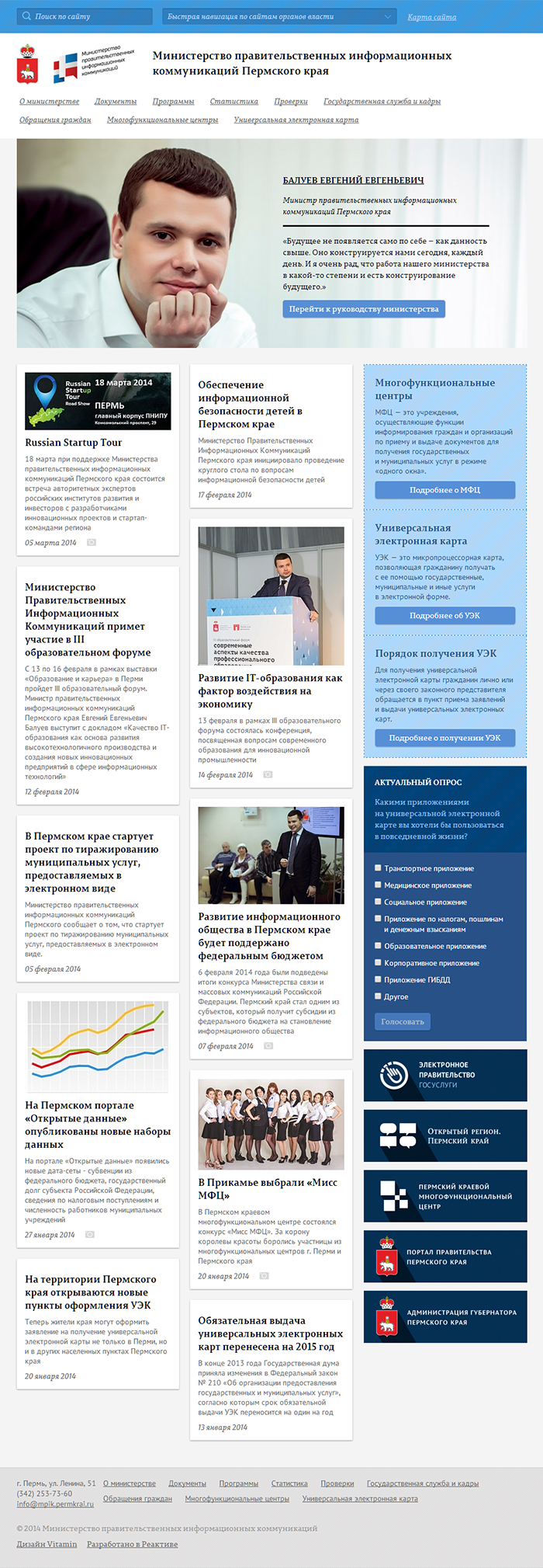 Сайт разработан в очень сжатые сроки на базе платформы «1С Битрикс: Официальный сайт государственной организации». Реализована возможность организации различных видов голосований и опросов. К публикациям можно добавлять сразу несколько галерей с фотографиями. Приложенные к публикациям документы можно смотреть не скачивая, с помощью сервиса OneDrive. Дизайн сайта разработан Витамином.