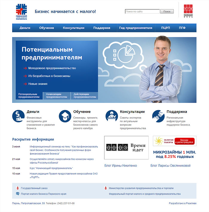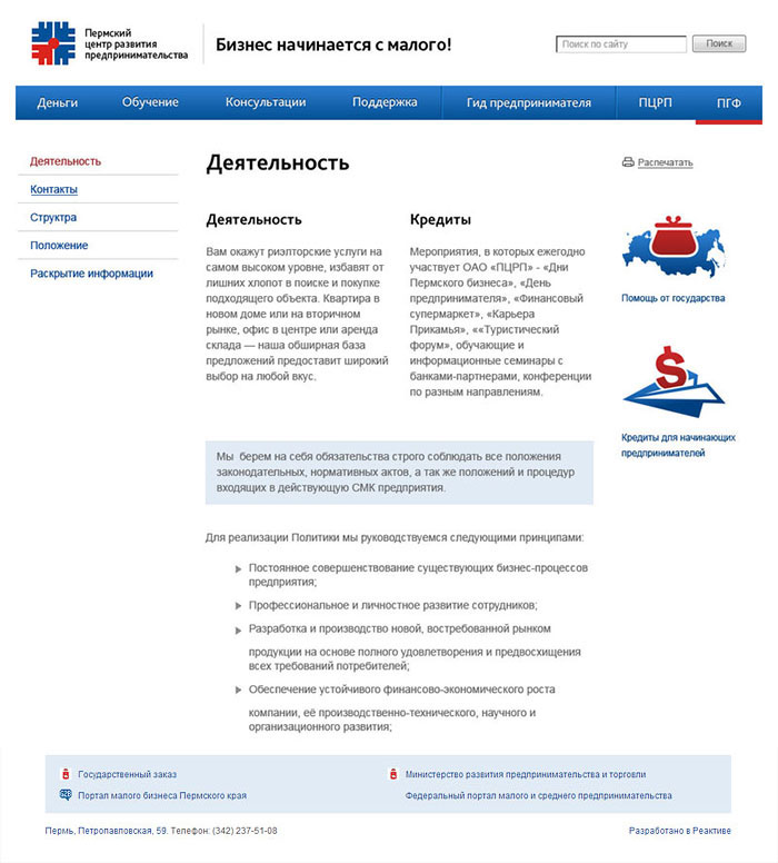 Разместили информацию о программах центра, разбив её на четыре больших направления. Создали гид предпринимателя. Дали необходимую контактную информацию.