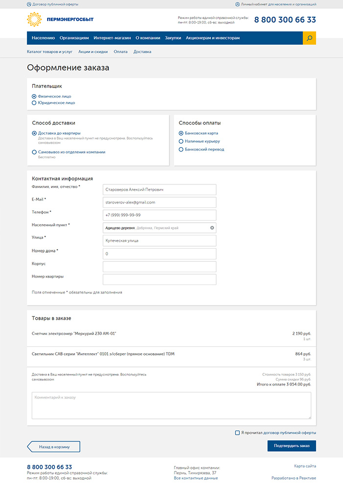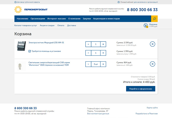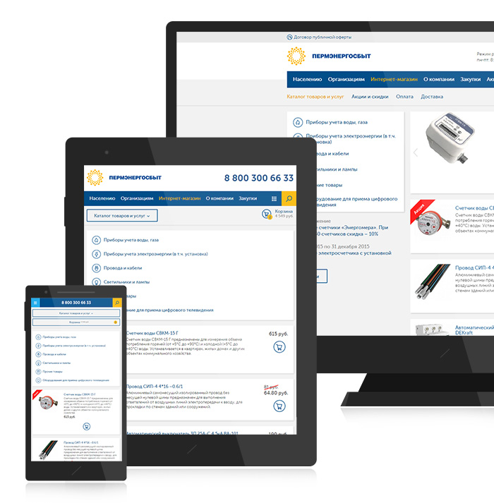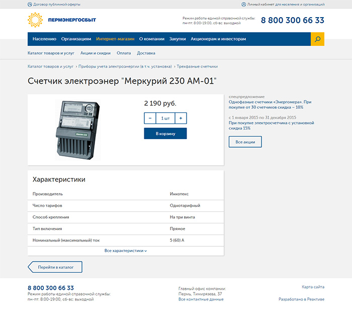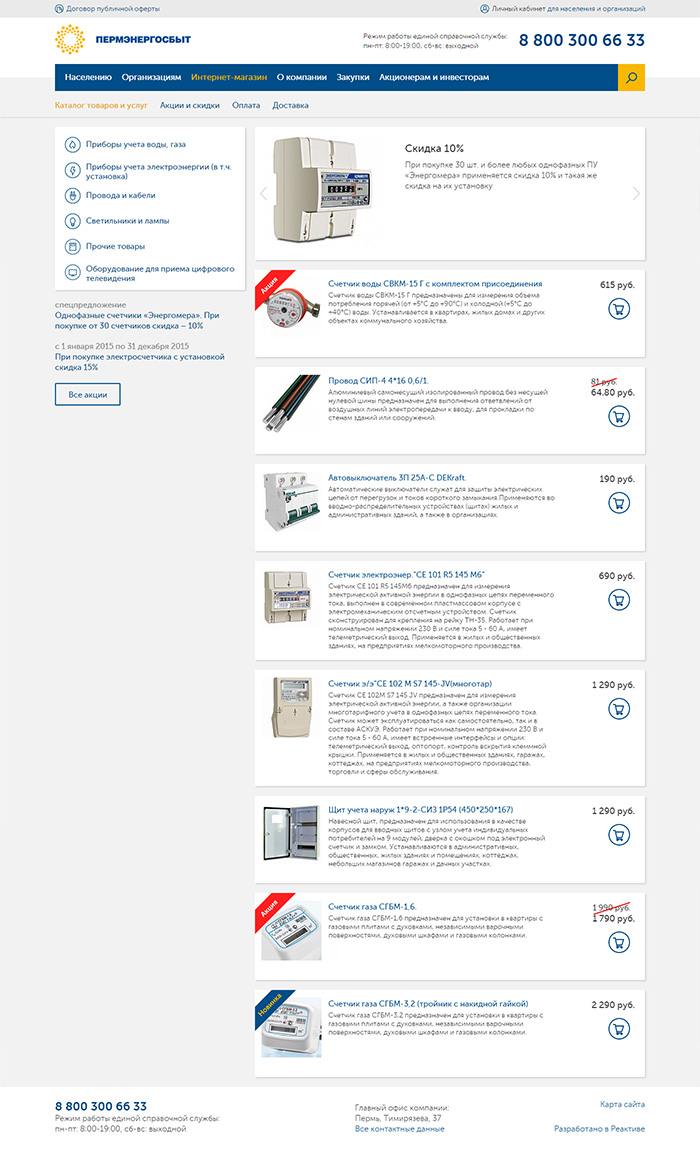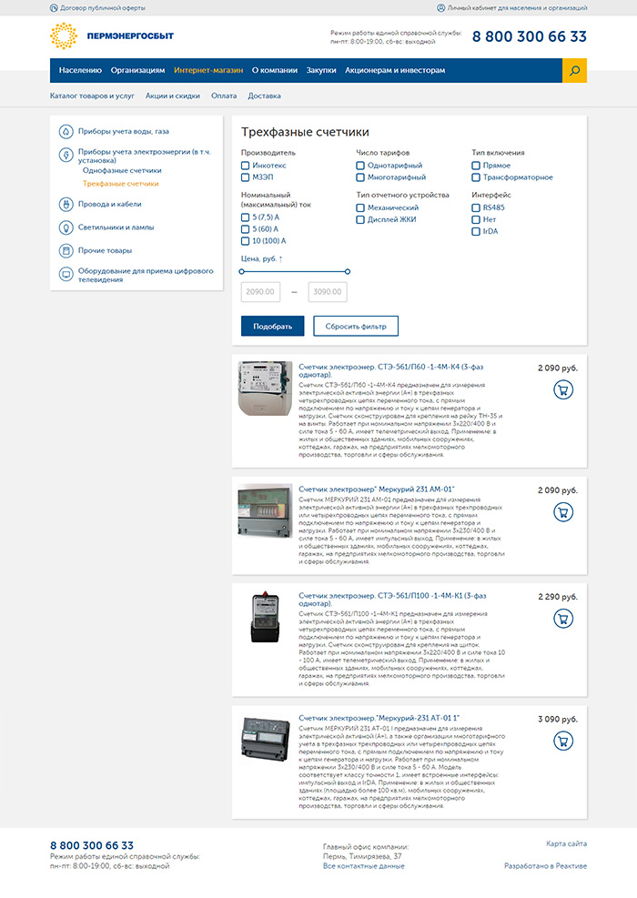 Клиент продает большое количество бытового электрооборудования, которое также может установить и настроить. В помощь классическим продажам нами был разработан интернет-магазин, в котором жители могут не только купить новый счетчик, но и заказать его установку сертифицированными специалистами.