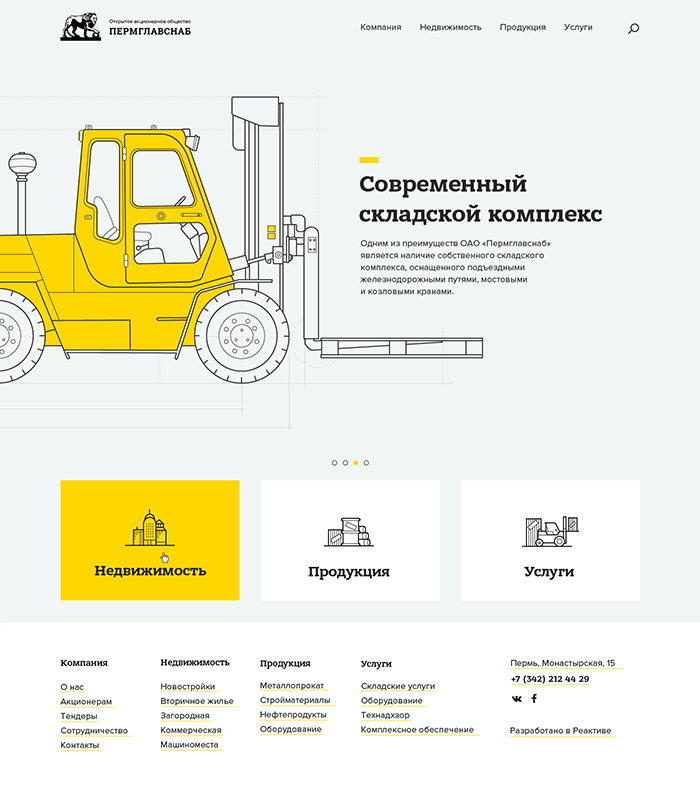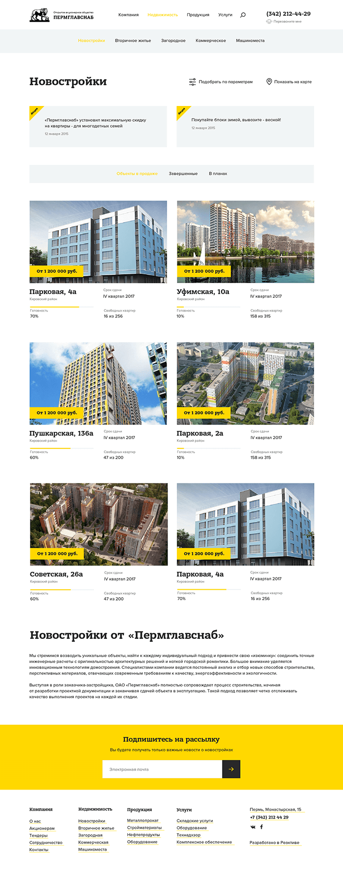 Раздел «Недвижимость» включает самые разнообразные ее виды. Здесь пользователям предлагается впечатлиться новостройками «ПермГлавСнаб», изучить предложения на рынке вторичного жилья, выбрать себе участок земли для загородного участка, забронировать машиноместо или присмотреть офис для покупки или аренды. Под каждую задачу создана хорошо продуманная структура навигации и удобная функциональность с разнообразными фильтрами, формами заявки, слайдерами и возможностями продвижения. Для того, чтобы разнообразие информации все же упорядочить и не запутывать пользователей, большинство страниц создано по одному удобному и понятному шаблону.