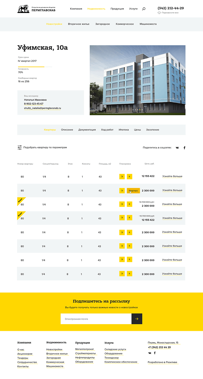 Раздел «Продукция» от недвижимости не отстает. Компании есть что предложить своим покупателям. Мы постарались, чтобы пользователи могли быстро сориентироваться в ассортименте, набрать нужное в корзину и отправить заказ менеджеру. На страницах разделов, подразделов и продуктов представлена подробная и актуальная информация о каждом товаре: есть описание, сопутствующие документы, сертификаты и цены.