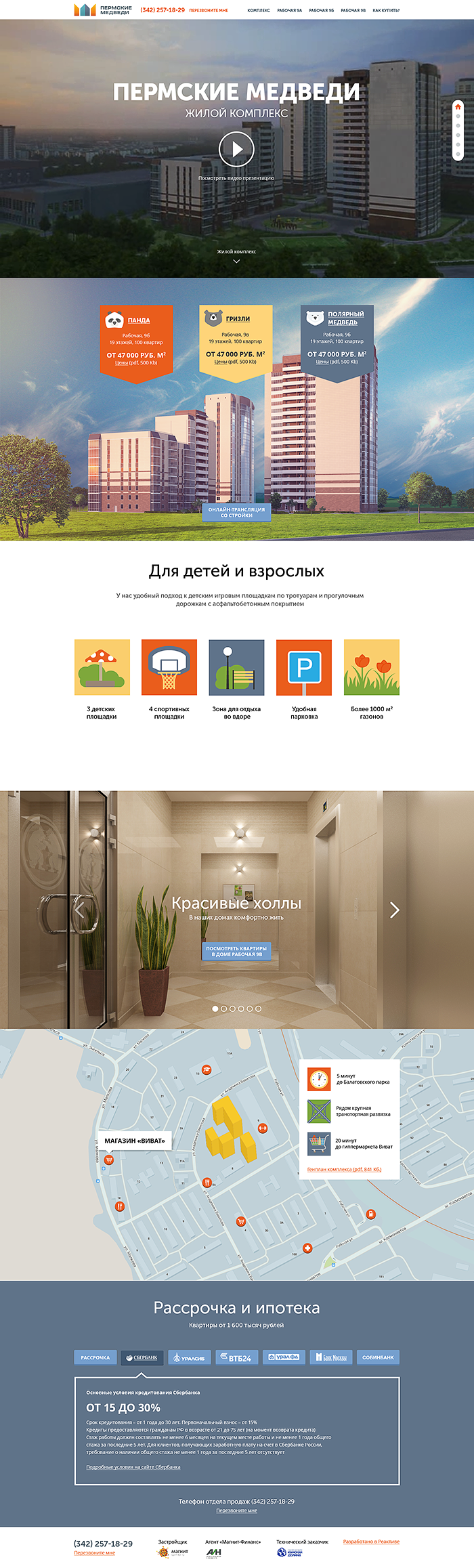 Есть интерактивная карта жилого комплекса. Отрисована детальная карта района с важными для будущих жильцов местами: остановками общественного транспорта, магазинами, поликлинниками, парком. Дана информация о кредитных программах и